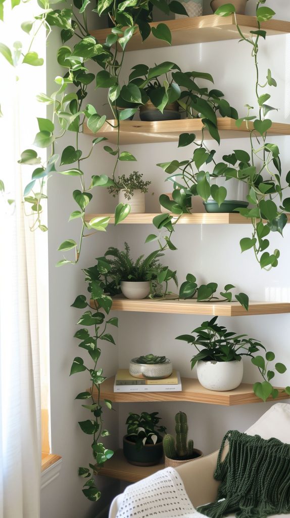 Use multiple corner shelves stacked vertically to maximize space. Place trailing plants like pothos or ivy to cascade down the shelves. Add a small reading chair or a cozy nook beneath the corner shelves for added functionality.