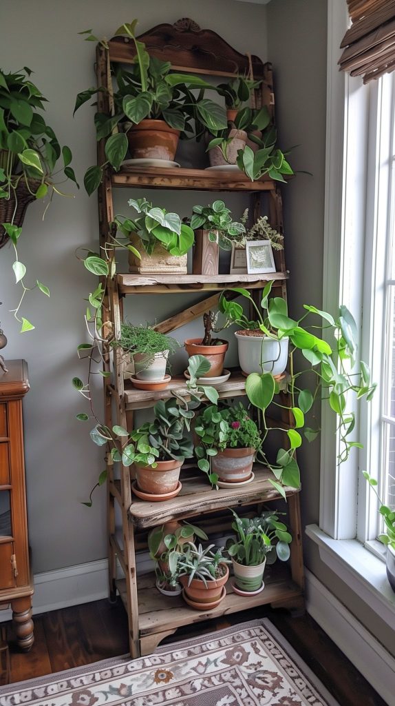 Ladder shelves are a trendy and versatile option. They can be leaned against a wall, providing a tiered display for your plants.