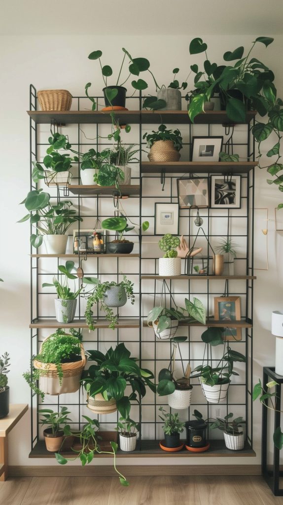 A wall grid shelf is a versatile and modern option. It can hold plants, photos, and other decorative items.