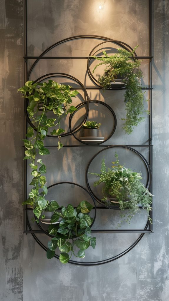 Use multiple circular shelves of different sizes for a dynamic look. Place small to medium-sized plants on the shelves. Combine with other geometric shapes for a modern aesthetic.