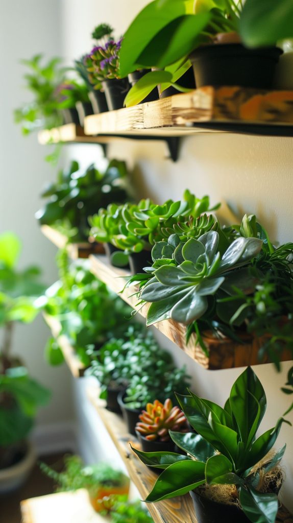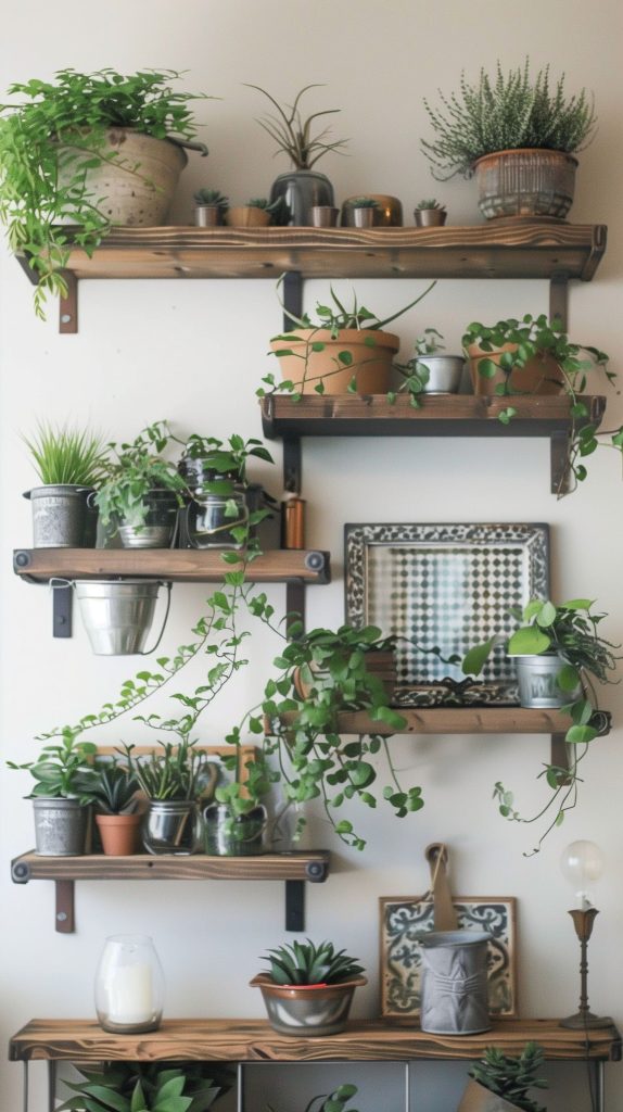 Use shelves of different lengths and depths for variety. Combine with artwork or mirrors for a mixed-media look. Add trailing plants to the top shelves for a cascading effect.