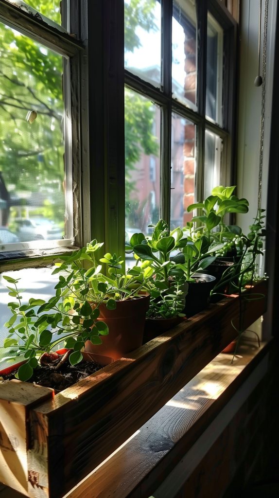 Use boxes with built-in drainage to prevent overwatering. Combine herbs and small flowering plants for a colorful display. Add a bench or seating area below the window for a cozy spot.