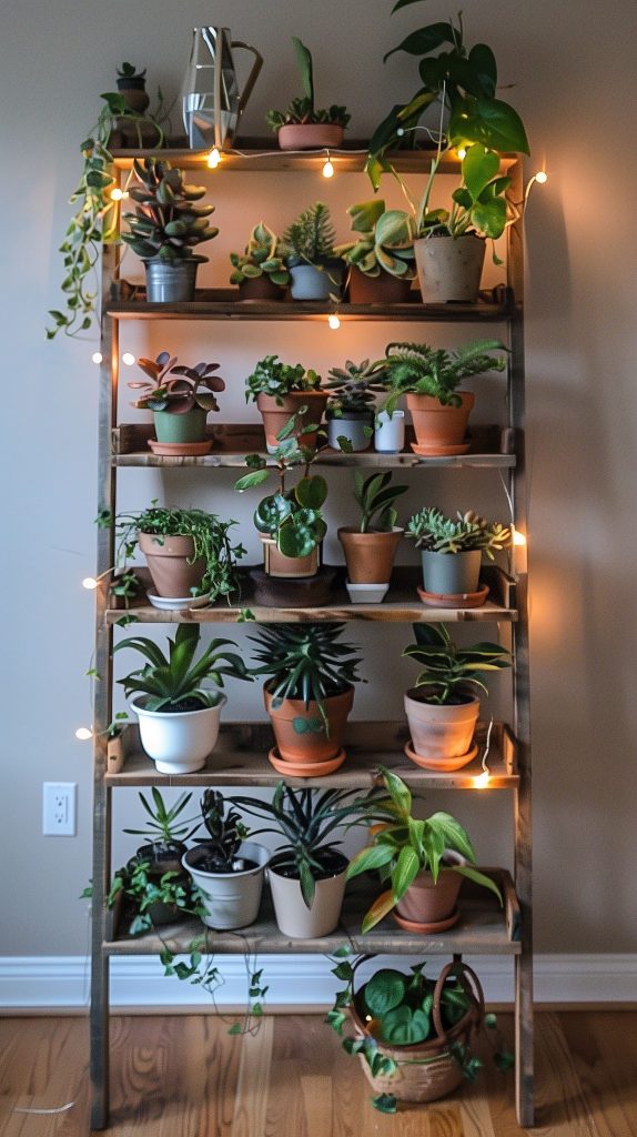 Mix different heights of plants, placing taller ones on the bottom shelves and smaller ones on top. Choose a ladder shelf with a finish that complements your existing decor. Add string lights to the ladder for a magical touch.