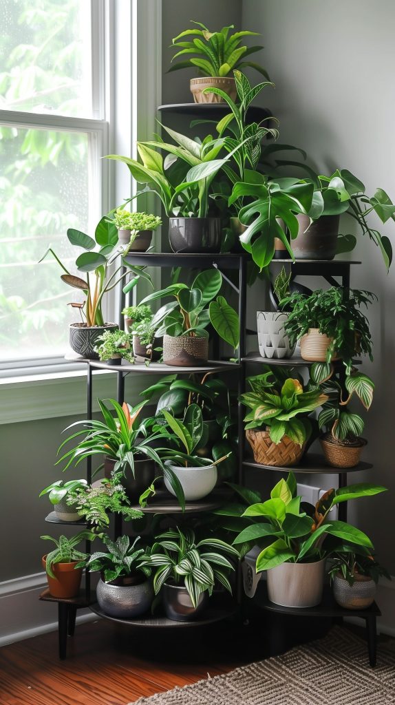A tiered corner stand is a freestanding option that maximizes corner space. It’s perfect for creating a lush plant display in any room.