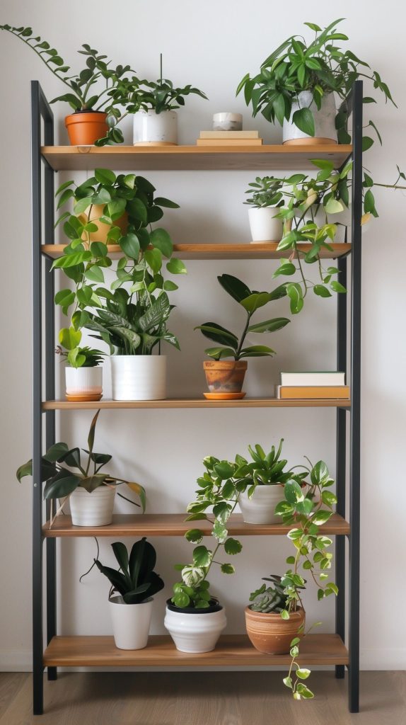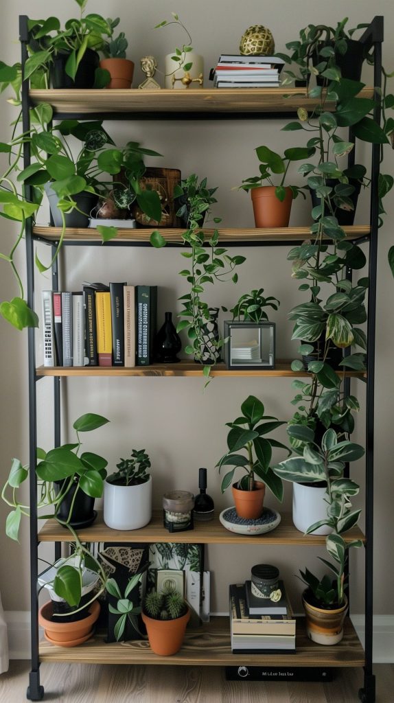 Mix books and plants for a functional and decorative setup. Use bookends to create separate sections for plants. Place trailing plants on the top shelf to let them drape down the sides.