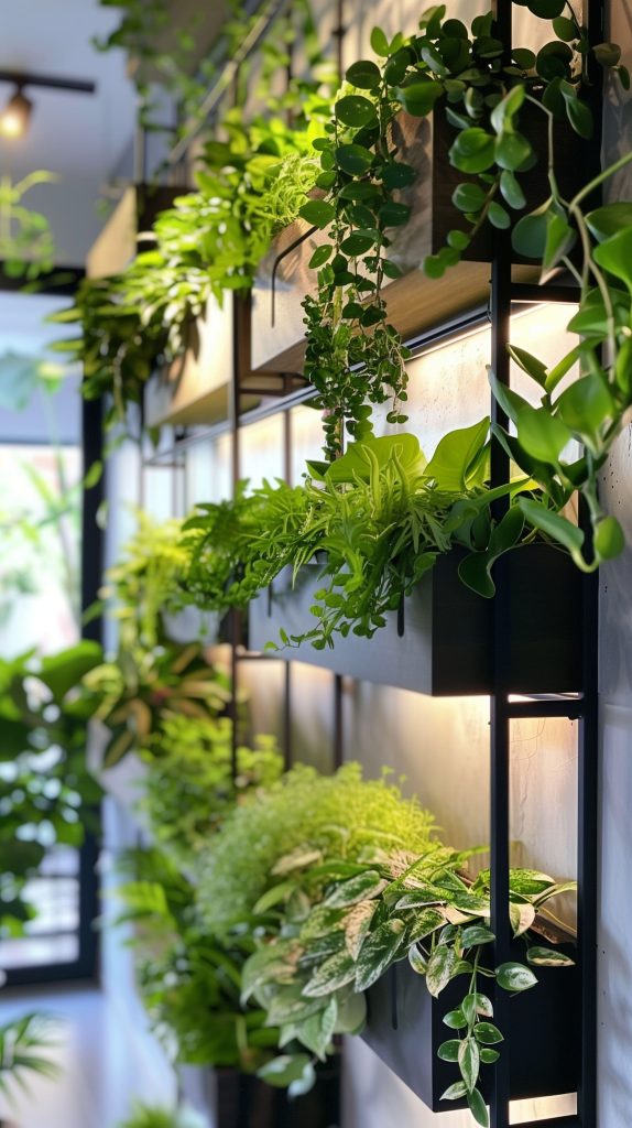 Shelves with integrated lighting provide both functionality and style. They can highlight your plants and create a warm ambiance.
