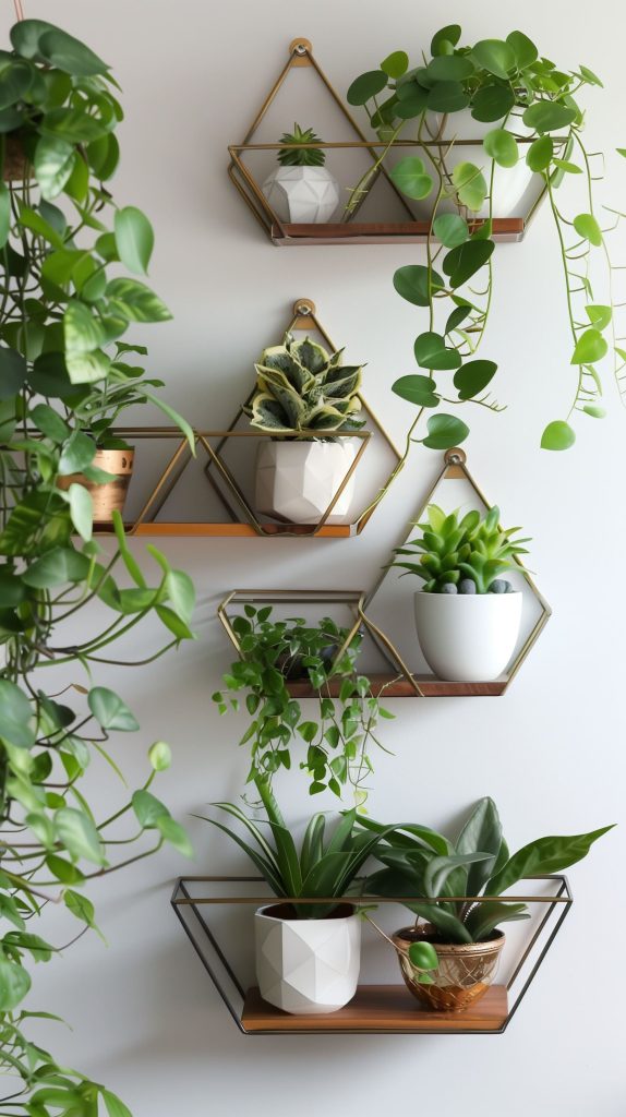 Geometric shelves add a modern and artistic touch to your plant display. These shelves come in various shapes like hexagons, triangles, and circles.