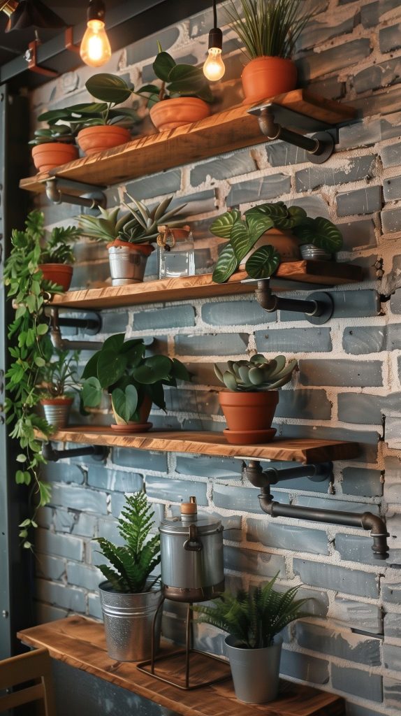 Combine these shelves with industrial-style decor, like metal furniture and exposed brick walls. Use metal planters to enhance the industrial theme. Add Edison bulb string lights for a warm, inviting glow.