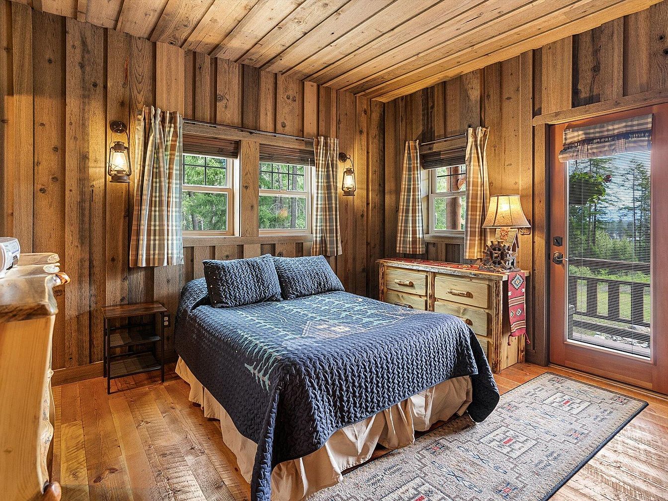 This inviting bedroom features natural wooden walls and ceiling, creating a warm, cabin-like atmosphere. The wood’s rich texture and varying tones provide rustic charm and a sense of coziness. A dark blue quilted bedspread with matching pillows sits atop a beige bed skirt, adding contrast while complementing the earthy palette. The room is illuminated by vintage-inspired lantern sconces on either side of the windows and a classic table lamp resting on a log-style dresser adorned with a decorative runner. Plaid curtains frame multiple windows, and a patterned area rug anchors the hardwood floor, enhancing the overall warmth.