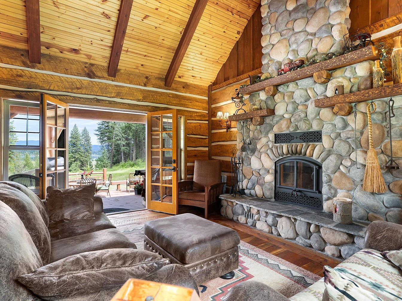 This living room exudes rustic charm with its vaulted ceiling featuring exposed wooden beams and warm-toned pine paneling. The focal point is a grand river rock fireplace, adorned with sturdy rough-hewn wooden mantels that display quaint vintage décor. Plush brown leather seating and an ottoman offer a cozy spot to unwind, complemented by a single wooden armchair near the hearth. French doors open wide to reveal a scenic outdoor deck and lush greenery, flooding the space with natural light and seamlessly blending indoor comfort with nature’s tranquility. A Southwestern patterned rug anchors the seating arrangement.