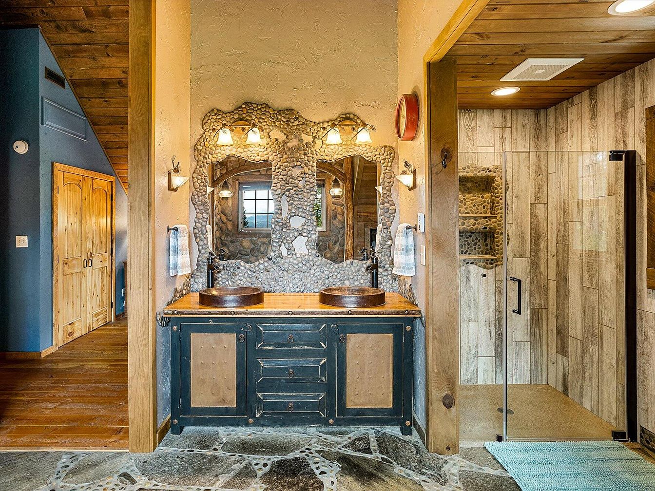 This cozy bathroom features a double vanity with a distressed, dark-wood cabinet accented by large panels in a tan tone. The countertop supports two round vessel sinks in a warm, copper shade paired with black faucets, enhancing the rustic charm. Above, two irregularly shaped mirrors framed with pebble stones contribute an organic, textured element, echoed by the matching pebble sconces on either side. The room boasts earth-toned walls and a stone floor in various shades of gray and beige, while a walk-in shower to the right is clad in wood-grain tiles, illuminated by recessed lighting in the wooden ceiling. Overall, the design blends nature-inspired materials with warm tones for a charming, cabin-like aesthetic.