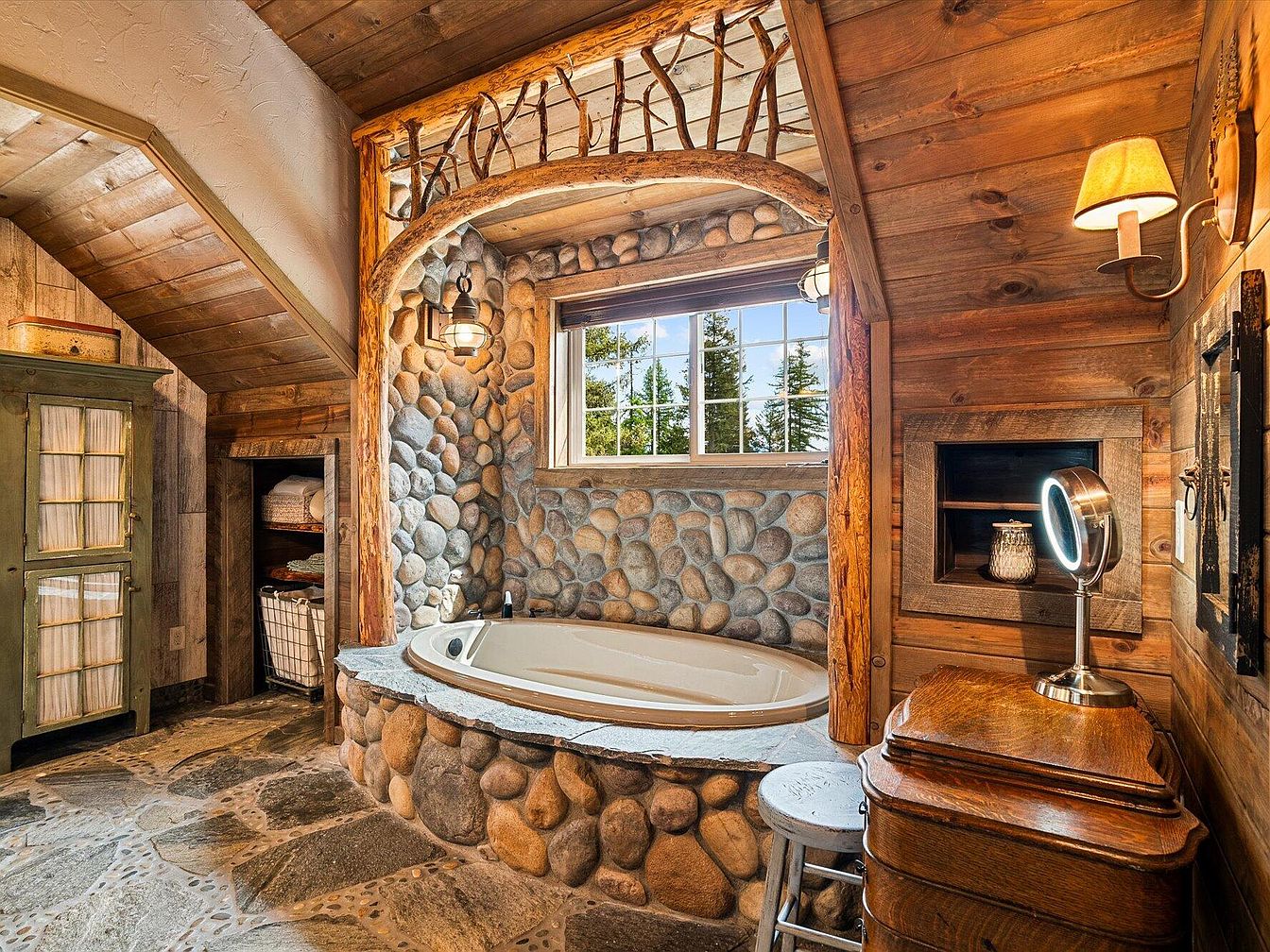 This cozy bathroom features a rounded bathtub encased in smooth river rocks, giving it a natural, earthy appeal. The walls are clad in warm wooden planks, complemented by a stone floor that enhances the rustic cabin vibe. A large window above the tub allows natural light to flood the space, offering views of lush greenery outside. Unique wood accents, including a branch-style decorative arch above the tub, add character. Practical elements like a vintage wooden dresser, a small stool, a glass-front cabinet for linens, and soft, warm lighting complete this intimate, nature-inspired retreat.
