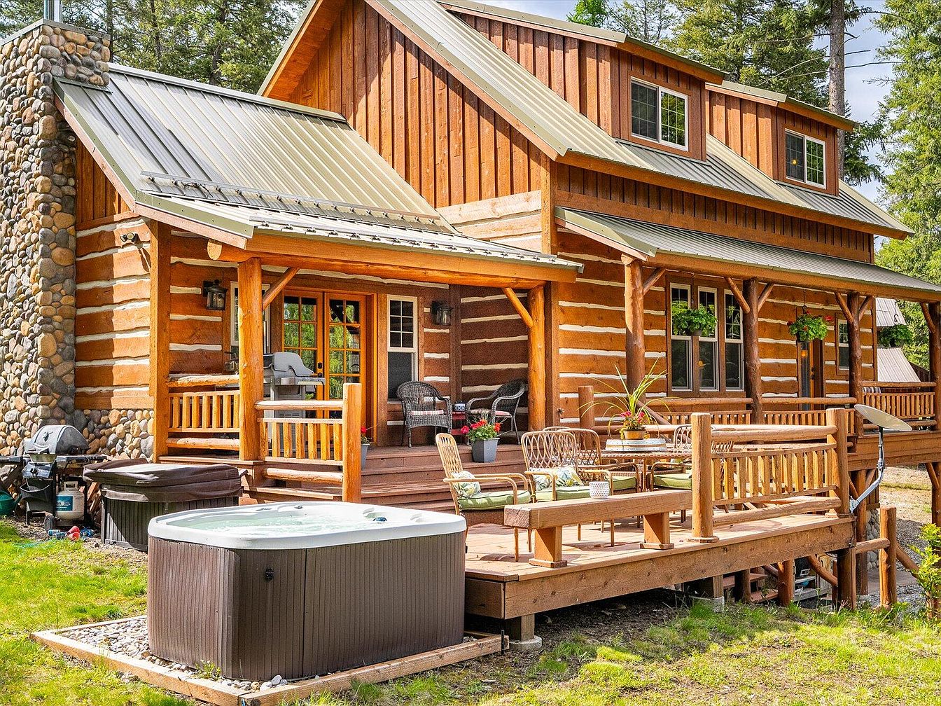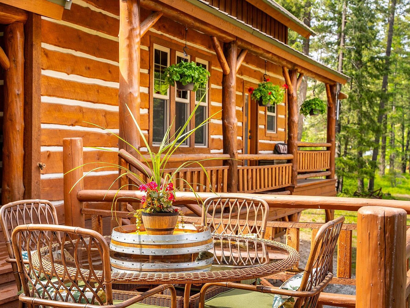 This charming backyard deck showcases a rustic log cabin exterior with warm wood tones and exposed log beams supporting a tin roof. The deck furniture includes woven wicker chairs with plush cushions and a round table adorned with a potted plant, creating a cozy outdoor seating area. A large hot tub sits adjacent, framed by natural landscaping and river rocks, complementing the rugged stone chimney on the side of the house. Hanging plants add greenery to the porch, and multiple glass-paneled doors open into the cabin, inviting in natural light and blending indoor and outdoor living.