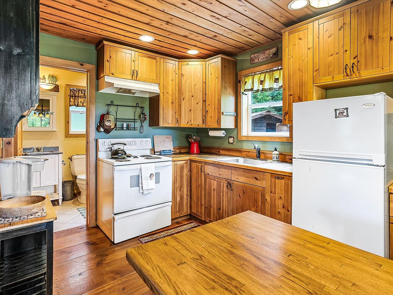 This cozy kitchen features a warm, rustic charm with natural wood cabinetry and ceiling paneling that enhances the cabin-like atmosphere. The cabinetry, made from knotty pine, complements the rich wood flooring and table, creating a harmonious organic feel. Sage green walls add a soothing backdrop, while the white appliances—including a stove, refrigerator, and range hood—contrast subtly for balance. A small curtain adorns the window above the sink, inviting natural light and a view of the greenery outside. A black utensil rack, a red pitcher, and simple fixtures add functional touches to this well-designed corner kitchen, connected to an adjacent bathroom visible through a natural wood-trimmed doorway.