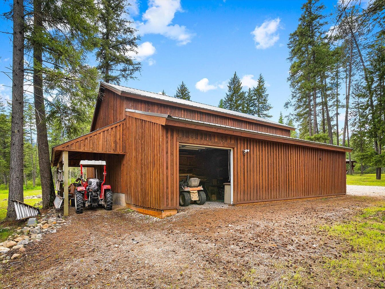 This rustic wood-paneled outbuilding serves as a practical outdoor workshop and storage space, blending naturally into its forested surroundings. The structure features warm-toned vertical wooden siding and a metal roof, suggesting durability and functionality. A covered side area shelters a small red tractor, indicating agricultural or landscaping use. The main area, accessed through a wide open garage door, houses a riding lawn mower and additional tools or equipment inside. The earthy gravel and pine needle covered ground complement the natural wood exterior, while tall pine trees and a bright blue sky frame the setting with a serene, outdoorsy ambiance.