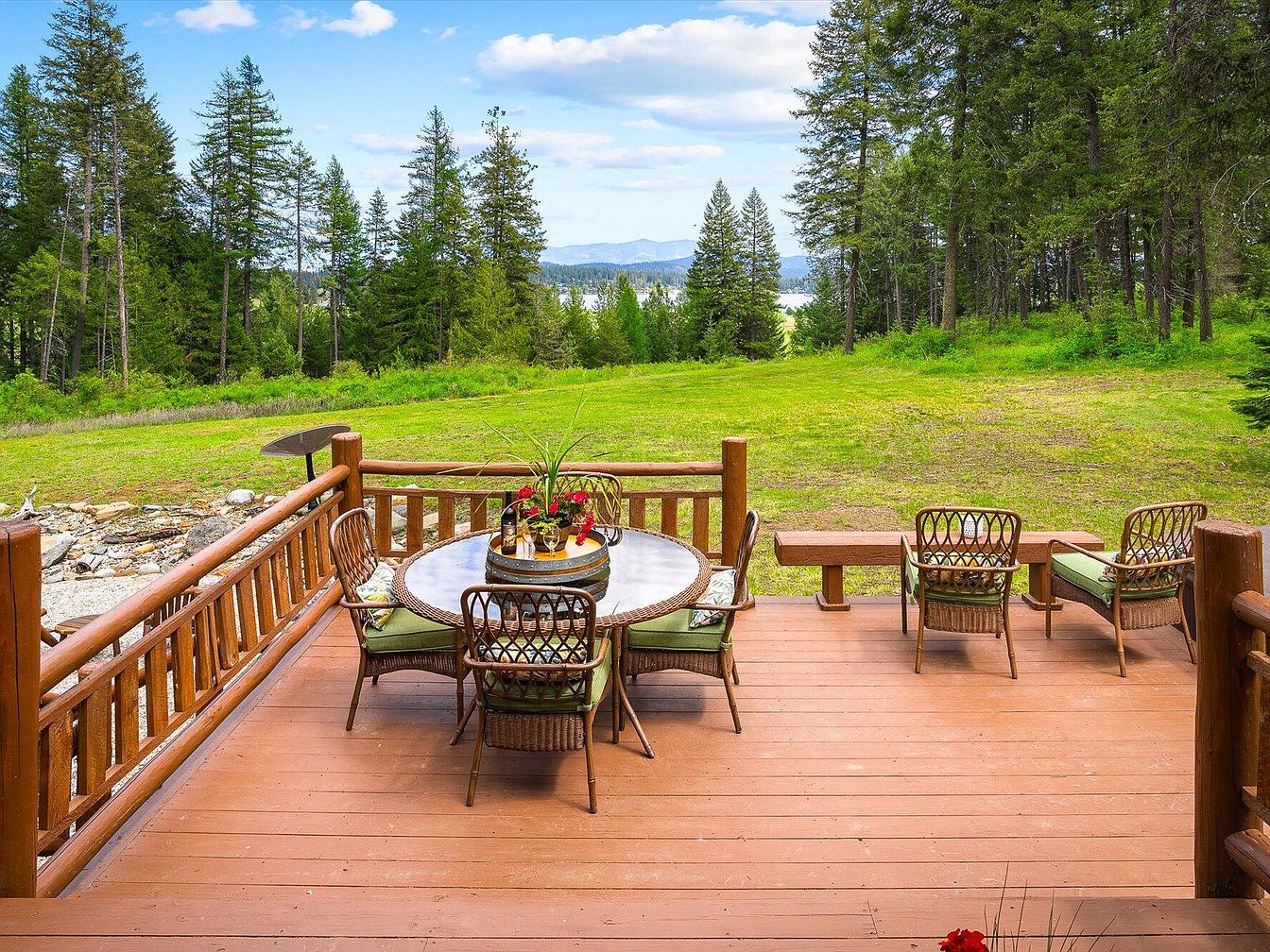 This inviting outdoor deck features warm, reddish-brown wooden flooring with matching log-style railing that enhances its rustic charm. A round glass-top table, surrounded by four wicker chairs with muted green cushions, forms the central seating arrangement. Nearby, two additional wicker chairs with green cushions accompany a wooden bench, creating a secondary, relaxed seating area. The deck overlooks an expansive grassy yard bordered by lush, tall pine trees, offering serene woodland and distant mountain views. The casual, natural design underscores a harmonious blend of comfort and the surrounding scenic landscape.