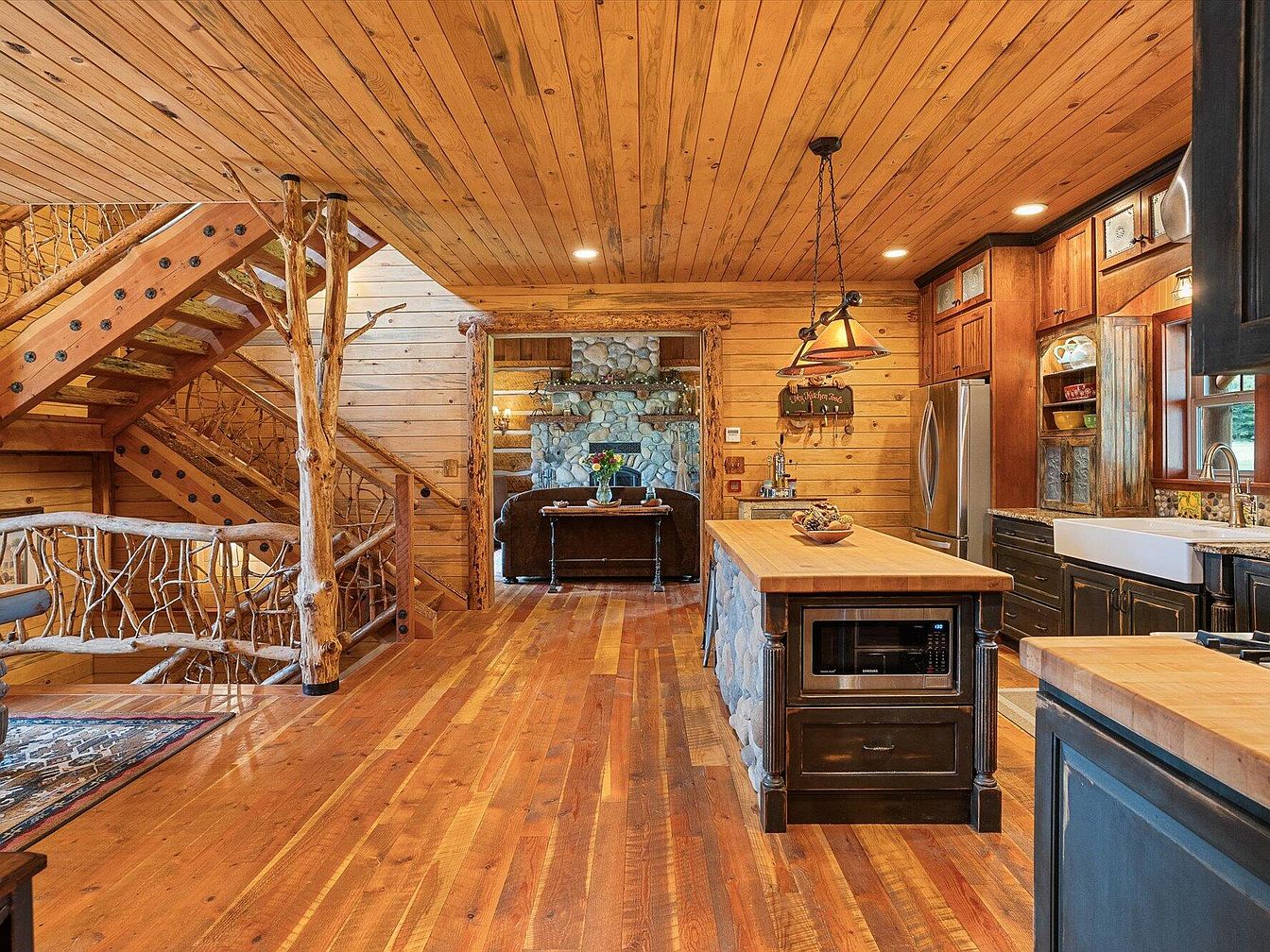This warm, inviting space combines rustic charm and practical design. Natural wood dominates with polished hardwood floors, a beadboard ceiling, and knotty pine walls. A sturdy wooden island with a butcher-block countertop takes center stage, framed by stonework matching the fireplace visible through the doorway. Dark cabinetry beneath the island contrasts the lighter wood tones, complemented by metal cabinet accents and stainless steel appliances. The handmade, branch-like staircase railing echoes nature, enhancing the cabin vibe. Soft lighting from a pendant fixture adds warmth, while the open layout invites ease of movement between the kitchen and living areas.