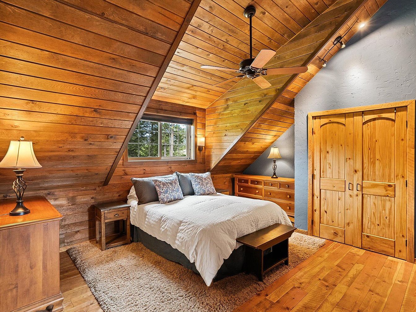 This intimate loft bedroom features a warm, rustic ambiance highlighted by wood-paneled sloped ceilings and walls, complemented by natural hardwood floors. A large bed dressed in white comforters and patterned pillows anchors the space, positioned beneath a wide window that invites natural light and offers views of lush greenery. The room incorporates multiple wood furniture pieces, including a dresser and nightstands with matching table lamps that emit a soft, welcoming glow. A ceiling fan with wooden blades hangs centrally, enhancing comfort. A plush area rug underfoot adds texture and coziness to the inviting, cabin-like retreat.
