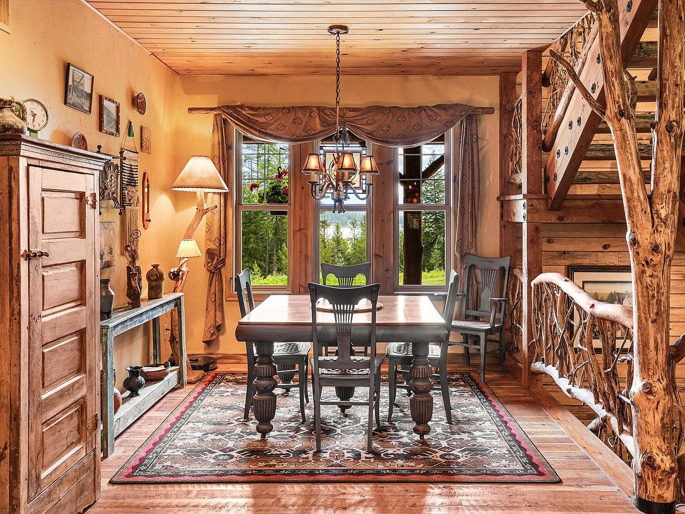 This cozy dining space features a solid wood table surrounded by six classic, spindle-back chairs painted in a muted gray-blue tone. The area is anchored by a richly patterned oriental-style rug in earth tones with deep reds, complementing the warm wood of the floors and ceiling. Large windows framed in natural wood provide a picturesque view of greenery outside, flooding the space with natural light. Unique rustic details include a handcrafted wooden staircase railing with natural branches and a vintage-mounted sideboard adorned with pottery and stands supporting softly glowing lamps, enhancing the inviting, lodge-inspired ambiance.