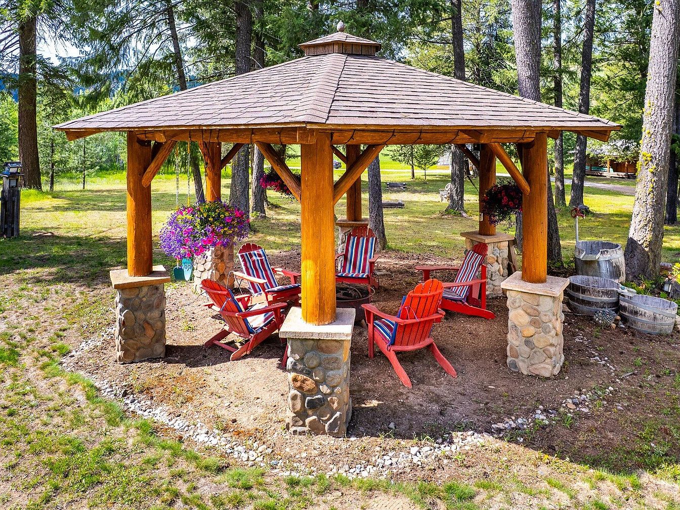 This charming outdoor gazebo features a robust wooden structure with a shingled roof, supported by six polished log pillars that rest on stone bases, blending rustic and natural elements beautifully. Surrounding a central fire pit are vibrant red Adirondack chairs adorned with striped cushions in blue, red, white, and beige tones, adding a pop of color and comfort. Lush hanging flower baskets contribute bursts of purple and pink, enhancing the space’s inviting and cozy ambiance. Nestled among tall trees, this serene setting offers a perfect blend of rustic charm and comfortable outdoor living.