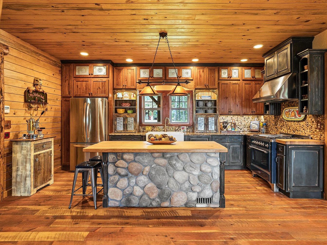 This kitchen features a warm, rustic aesthetic with natural wood elements throughout. The ceiling and walls are clad in rich, honey-toned wood planks, creating a cozy cabin feel. The island stands out with its smooth wooden countertop and a base covered in large, rounded river stones, adding texture and earthiness. Dark blue cabinetry contrasts with the warm wood tones, paired with vintage-style metal hardware. A stainless steel refrigerator and range add a modern touch, while the stone backsplash with embedded small rounded stones enhances the natural theme. Pendant lights above the island provide soft, inviting lighting.