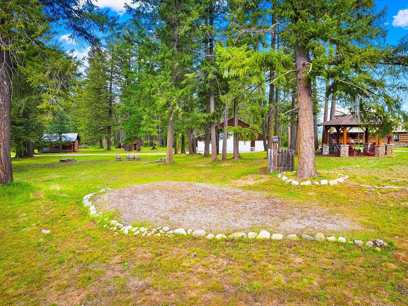 This spacious outdoor area features a natural, rustic aesthetic with tall pine trees scattered throughout a broad grassy yard. A distinct gravel section edged with smooth river rocks adds subtle landscaping interest and may serve as a fire pit or seating base. In the background, multiple wooden structures, including a cabin and a pavilion with stone pillars, offer cozy gathering spots that blend seamlessly with the forest environment. The area is designed for outdoor living and socializing, offering a peaceful retreat into nature with a harmonious mix of green foliage, natural stone, and wood tones under a vibrant blue sky.