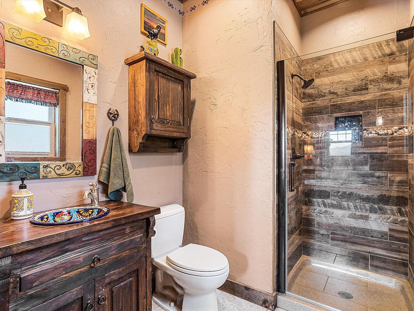 This bathroom blends rustic charm with warm, earthy tones. The vanity and wall cabinet are crafted from rich, dark wood with a distressed finish, offering ample storage and surface space. A colorful Talavera-style sink adds vibrant detail, complemented by a multi-hued, decorative mirror frame. The textured walls feature a soft beige plaster finish, enhancing the rustic feel. Opposite the vanity, a walk-in shower is enclosed with clear glass, showcasing wood-look tiles in varying shades of brown and a horizontal mosaic accent of stones. The compact toilet is positioned efficiently between the vanity and shower, completing this cozy, well-designed space.