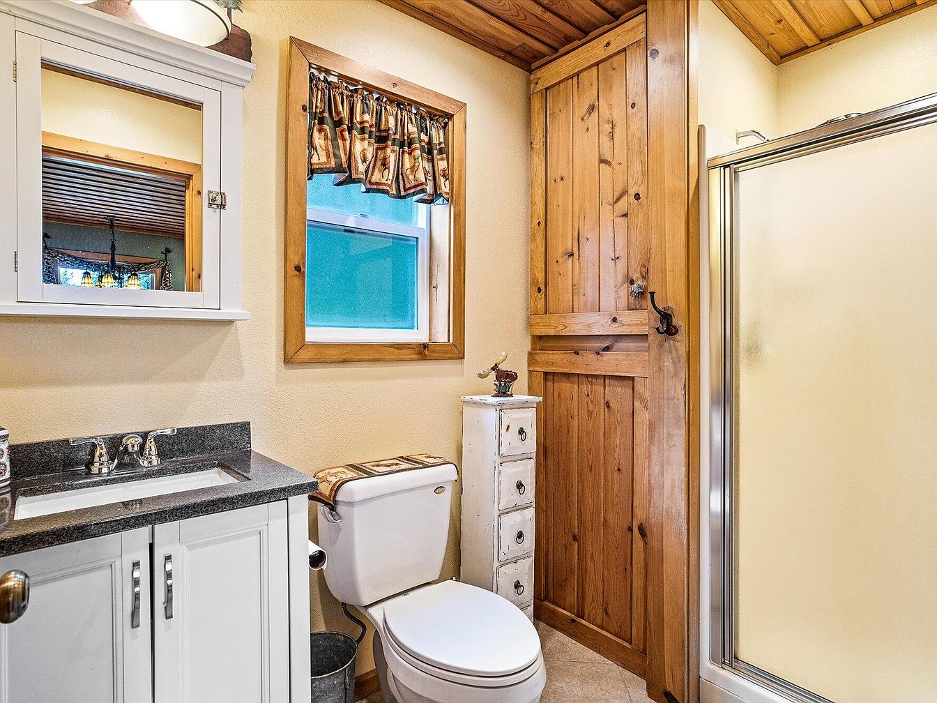 This bathroom corner features a warm, inviting atmosphere with natural wood accents and a rustic touch. The walls are painted a soft yellow, complemented by the natural wood ceiling and door, bringing a cabin-like charm. A white vanity with a black granite countertop holds a chrome faucet and is topped with a white-framed mirrored cabinet. Light filters through a small window with a patterned valance, while a white toilet sits adjacent to a tall, narrow vintage-style storage cabinet. A shower with frosted glass doors completes this well-organized and cozy bathroom space.