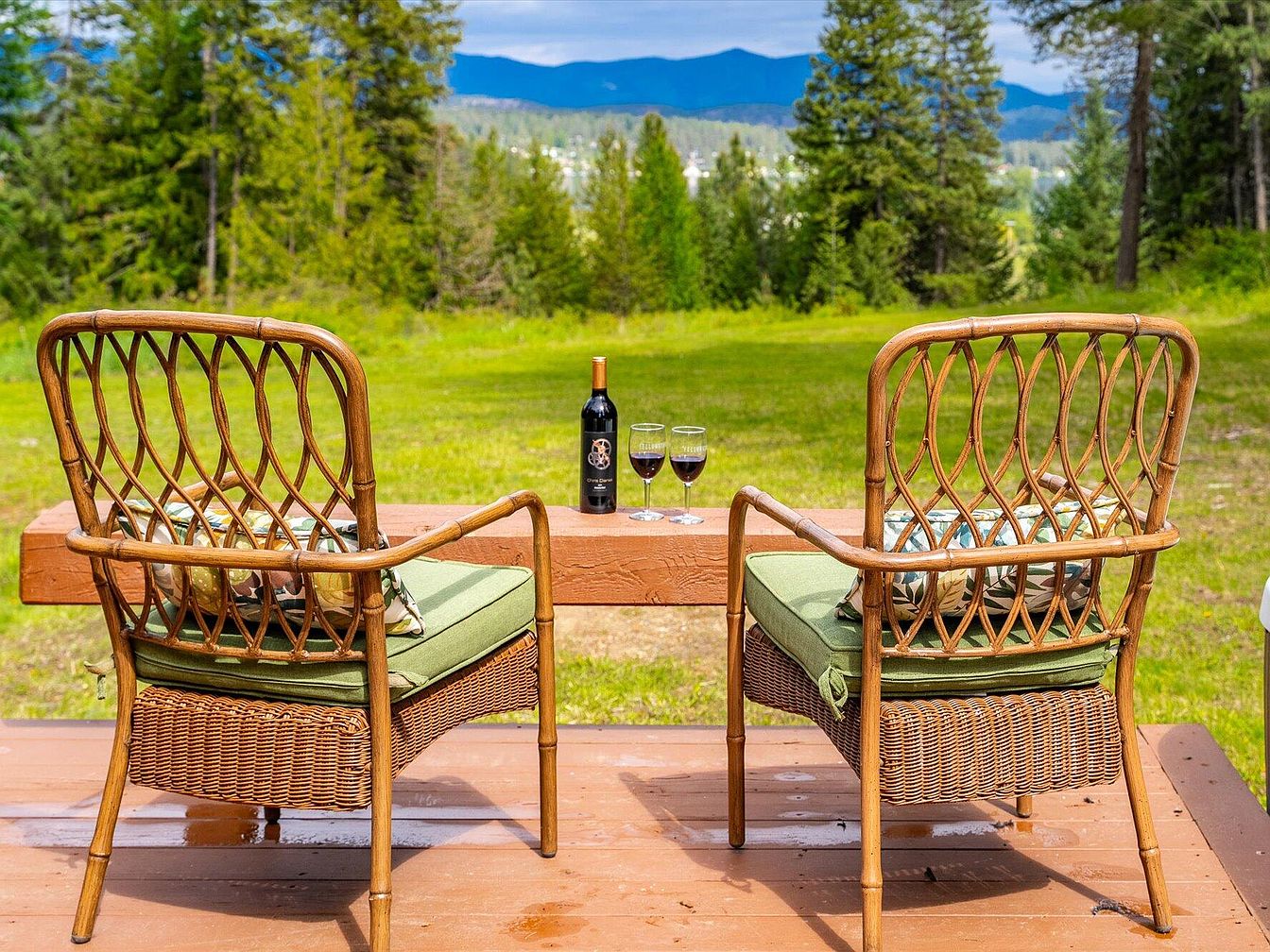 This inviting outdoor deck area offers a serene spot for relaxation or intimate conversation. Featuring two wicker armchairs with decorative lattice backs and green cushions, the seating is both comfortable and stylish. Positioned around a rustic wooden ledge that doubles as a small table, it currently holds a bottle of red wine and two filled glasses, suggesting an enjoyable leisurely moment. Beyond the deck, expansive green grass stretches into a lush forest with tall pine trees, and distant blue mountains frame the horizon. The natural color palette enhances the peaceful, nature-centric ambiance of this outdoor retreat.
