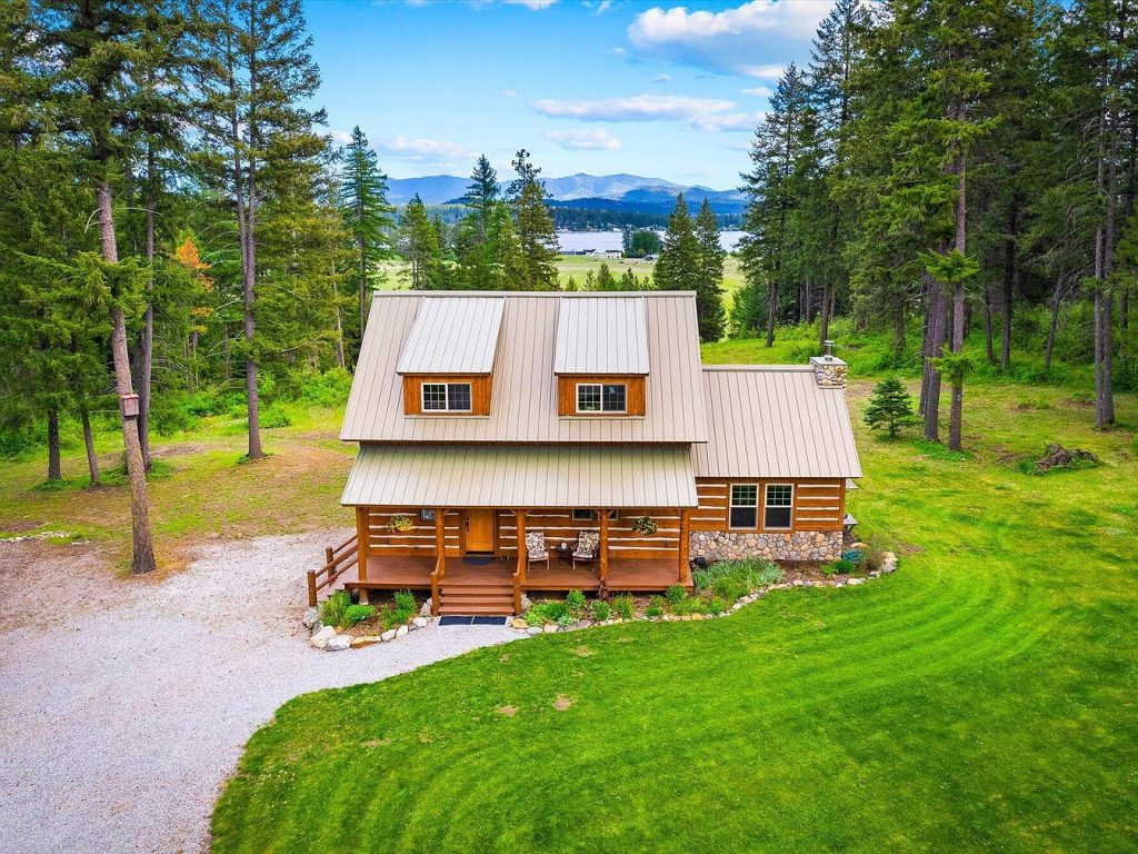 This scenic view showcases a serene outdoor setting featuring two rustic cabins surrounded by tall, lush evergreen trees. The main cabin has a natural wood facade with a beige metal roof and a cozy covered porch, evoking a classic mountain retreat feel. Nearby, a smaller cabin also features a matching metal roof and a red-toned exterior with a covered porch that includes seating and decorative elements like a wagon wheel. Both structures are connected by a curved gravel pathway, winding through a well-maintained lawn. In the foreground, a charming gazebo with wooden posts and a brown shingled roof sits amidst the trees, providing a quiet gathering spot. The landscape stretches toward a distant lake and rolling blue mountains, offering tranquil and immersive nature views that complement the rustic cabin aesthetic.