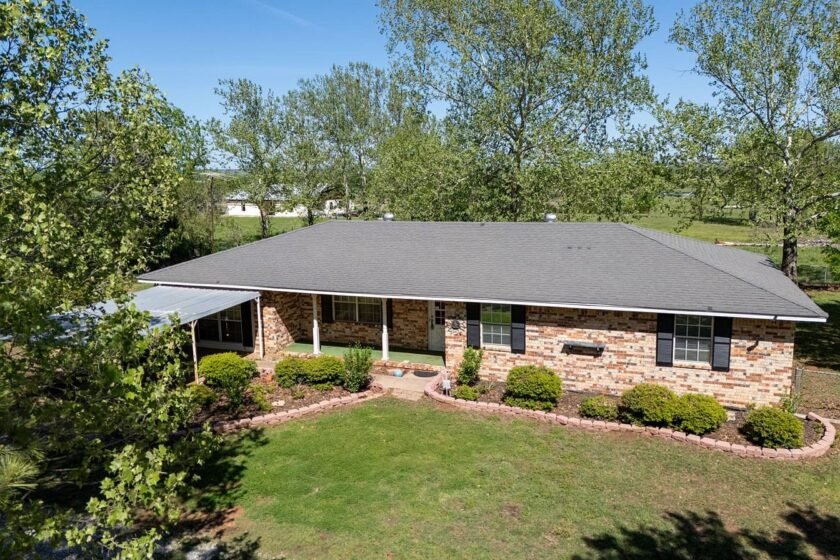 A single-story brick home exterior wall with a mix of beige and reddish bricks paired with black shutters on the windows. A neat row of well-maintained shrubs bordered by pinkish stone edging runs alongside the house. The structure has a simple roof overhang with a light trim. To the left, a covered walkway supported by thin posts extends from the house, providing shade. The grassy yard is spacious and open, with mature trees in the background providing natural shade. A chain-link fence encloses a small section near the rear corner of the house, blending functionality with the rustic, peaceful rural setting.
