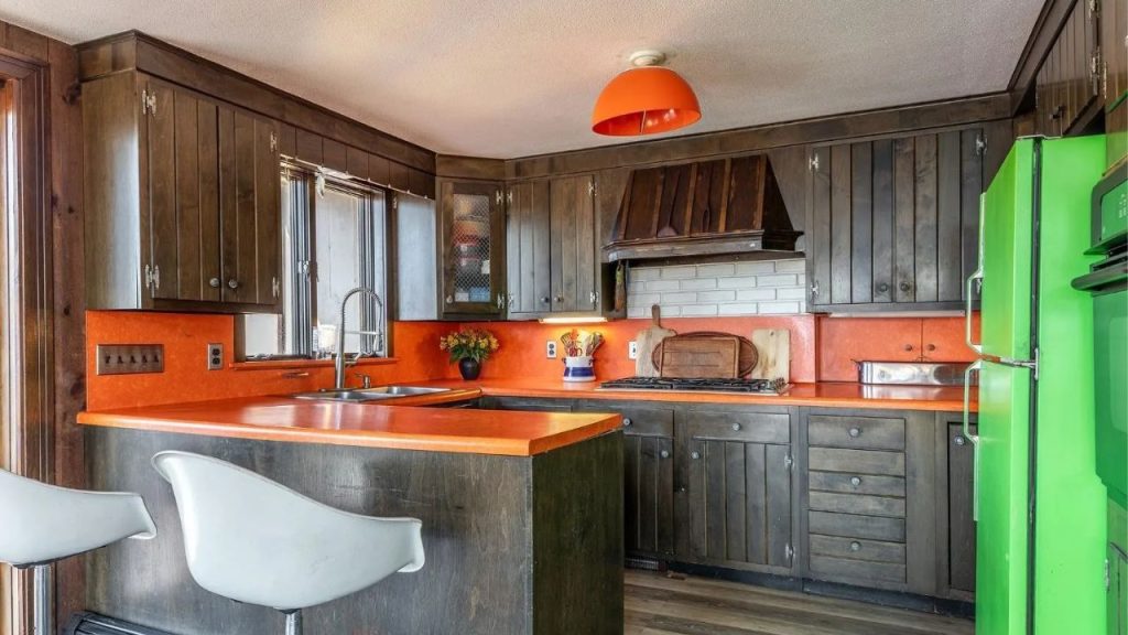 This vibrant kitchen bursts with retro charm, featuring bold orange countertops and backsplash that pop against rustic dark wood cabinetry. A bright green fridge adds a playful, vintage touch, while modern touches like a sleek gooseneck faucet and bar seating blend style with functionality. The space is compact yet efficient, offering plenty of storage and character. Natural light from the window above the sink enhances the kitchen’s warm, eclectic vibe, making it both fun and functional.