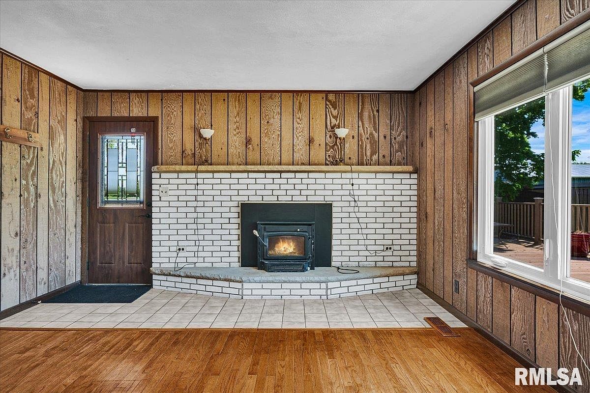 This cozy living room features a classic wood-burning stove set into a white brick fireplace that serves as the room’s focal point. The fireplace hearth extends across the wall with light-colored tiles creating a subtle contrast against the warm-toned hardwood floors. Natural wood-paneled walls envelop the space, lending a rustic, cabin-like charm enhanced by the natural grain and knots in the wood. A dark-stained wooden door with an intricate frosted glass insert adds character on one side, while a large window on the adjacent wall lets in abundant sunlight, brightening the space and offering views of the outdoor deck area. Minimalist lighting fixtures flank the fireplace, emphasizing simplicity and functionality in the room’s design.