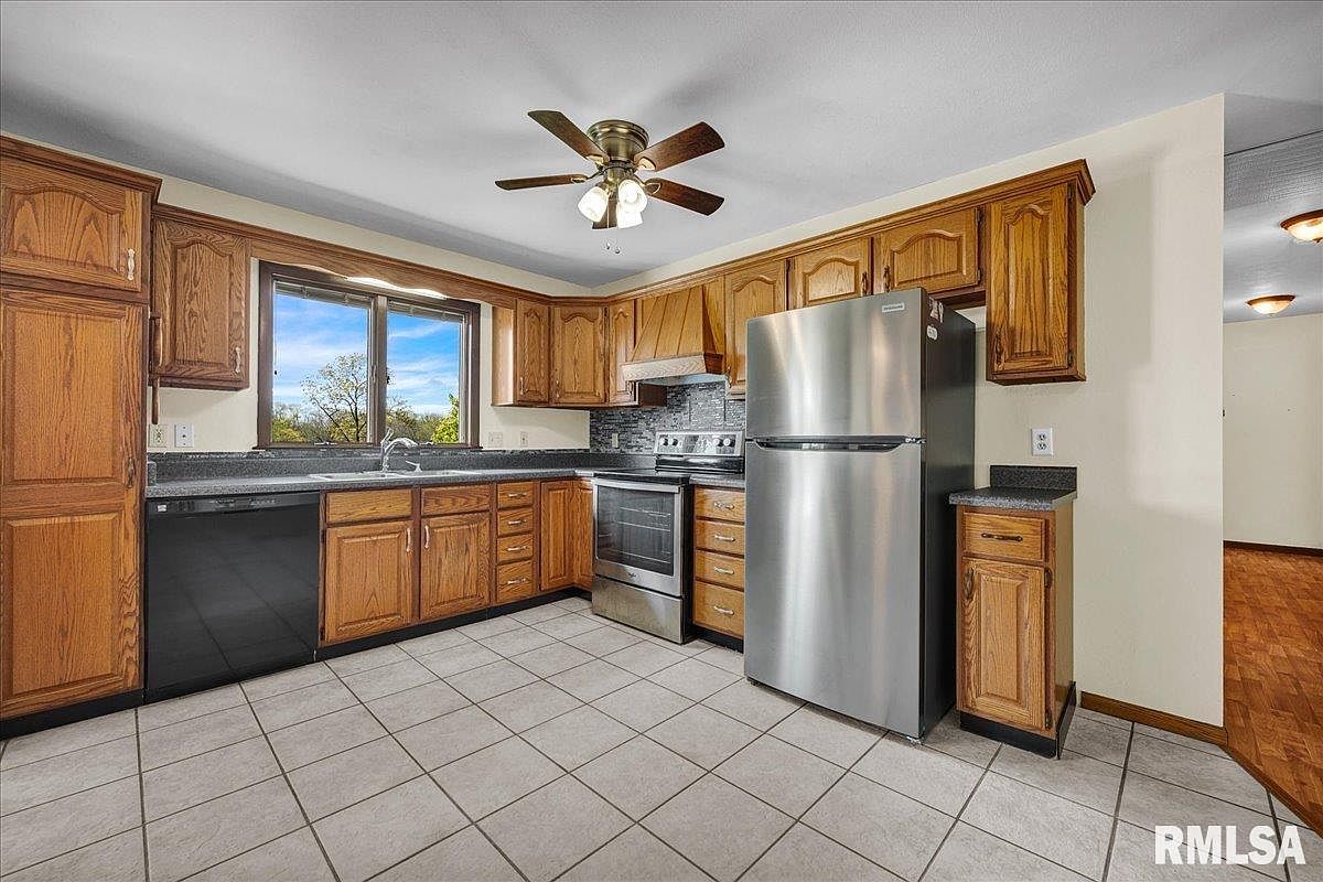 This spacious kitchen features an L-shaped layout with well-maintained wooden cabinetry in a warm oak finish, complemented by sleek dark granite countertops that provide ample workspace. A large window above the sink brings in natural light and offers views of greenery outside, enhancing the airy feel. The kitchen is equipped with stainless steel appliances including a refrigerator and an electric stove with a modern hood vent. The flooring is covered with light grey tiles that contrast subtly with the cabinetry while maintaining a neutral palette. A ceiling fan with lights adds both air circulation and illumination, balancing practicality with classic design elements.