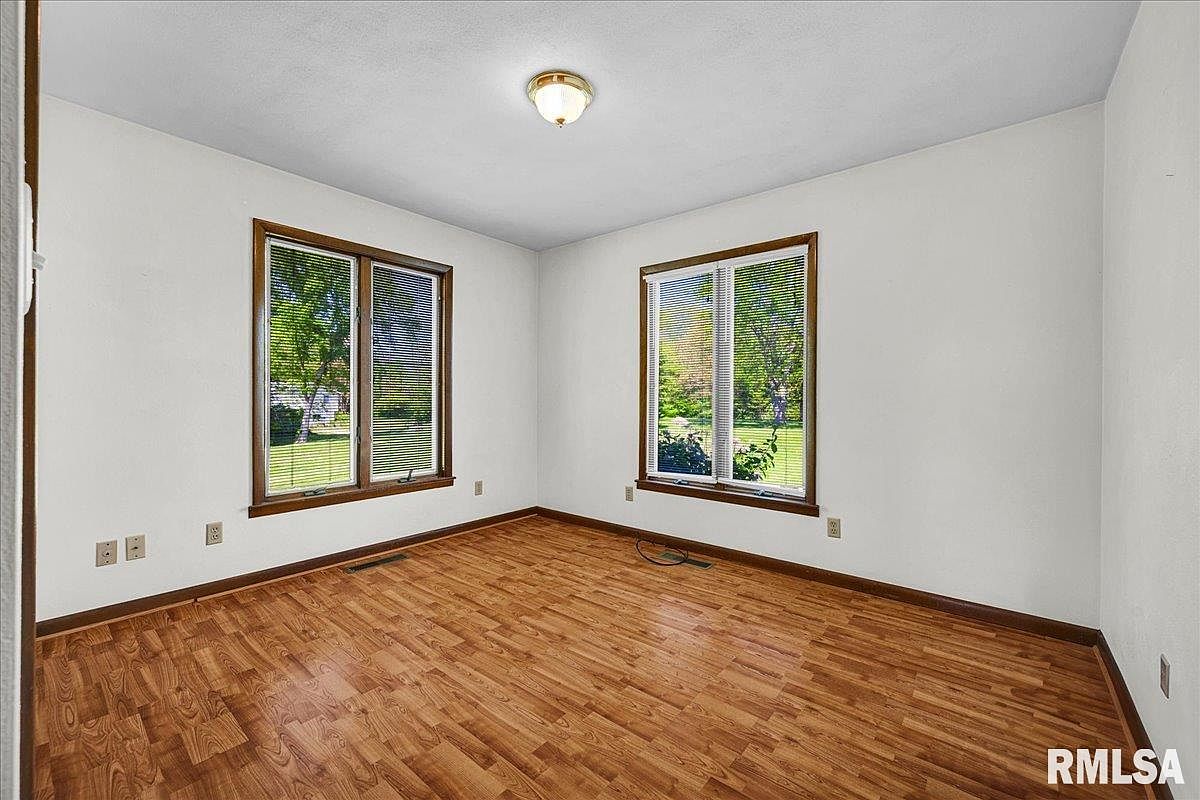 This room features a simple yet inviting bedroom corner with warm wood-tone flooring and matching baseboards, creating a cohesive natural aesthetic. Two large windows framed in wood trim allow ample daylight to flood the space, providing a view of lush greenery outside. The walls are painted in a clean, soft white that contrasts gently with the medium brown woodwork. A modest flush-mount ceiling light fixture adds soft illumination, while multiple electrical outlets along the walls hint at practical functionality. The open, uncluttered floor offers flexibility for various furniture arrangements.