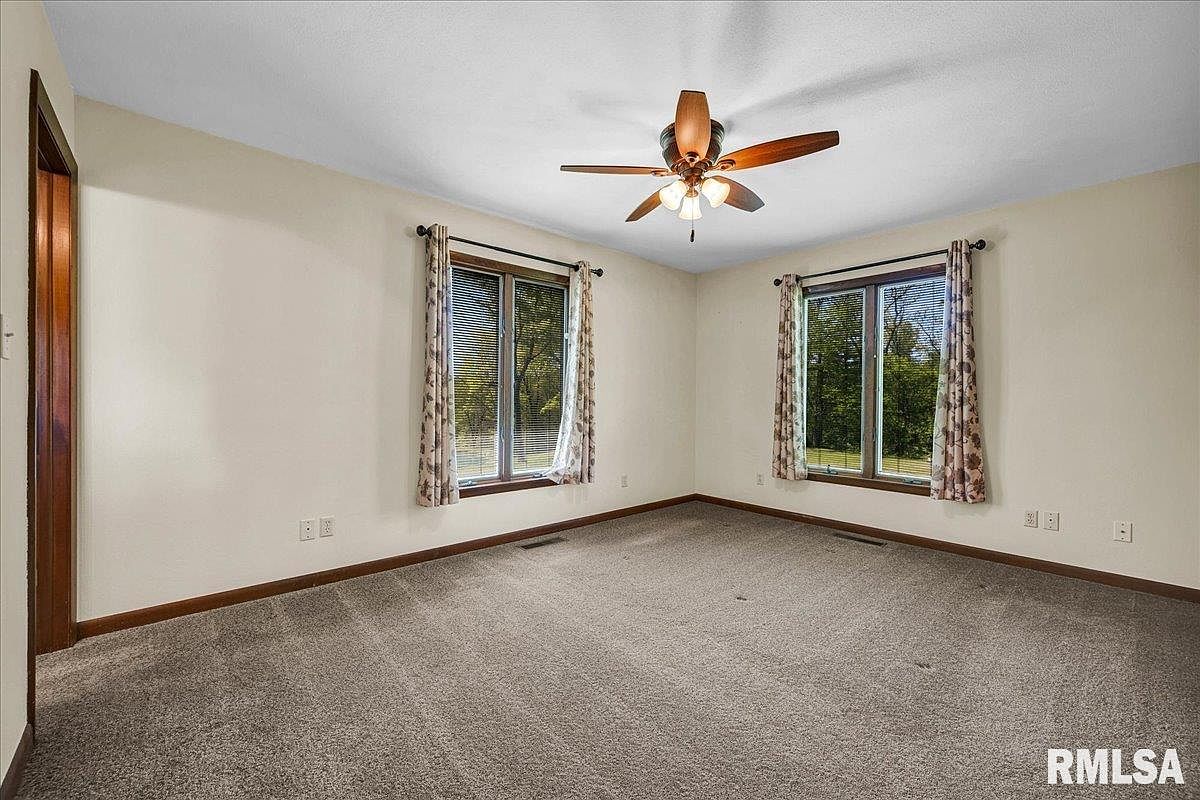 This cozy bedroom features a neutral color palette with cream walls and medium brown trim that adds warmth to the space. Two large windows dressed with soft floral curtains invite natural light, offering views of lush greenery outside. The floor is covered with a plush, gray-beige carpet that complements the calming tone of the room. A classic ceiling fan with wooden blades and light fixtures creates both comfort and style overhead. This uncluttered layout with minimal décor feels inviting and versatile, ready to be personalized as a restful retreat or guest space.