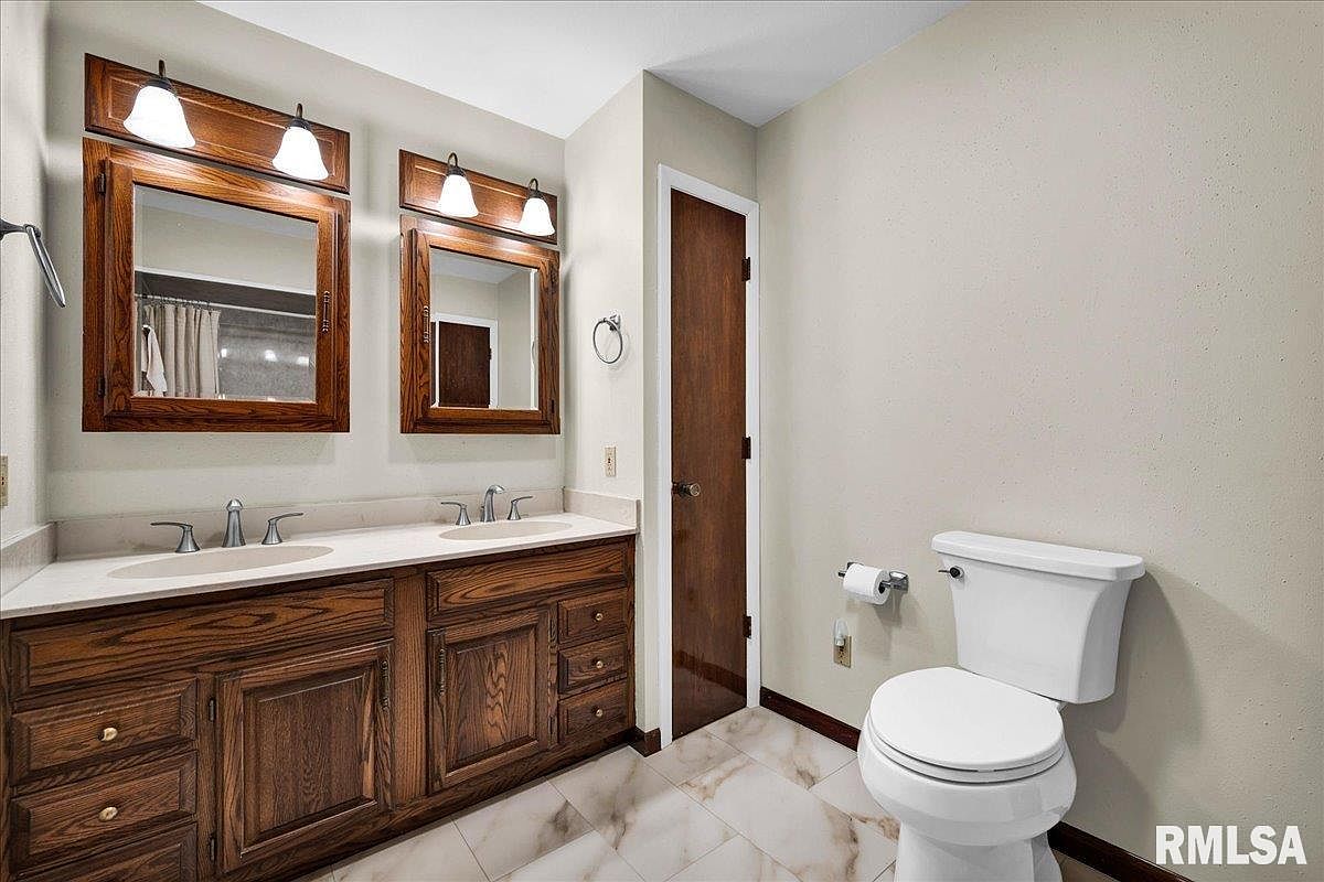 This bathroom features a double vanity setup with rich, dark wood cabinetry and matching framed mirrors that add warmth and traditional charm. Two sink basins sit beneath a sleek, light-colored countertop, complemented by brushed nickel faucets. Above each mirror, twin light fixtures provide focused, practical illumination. The walls are painted a soft beige, coordinating with the door and baseboards’ darker wood tones. The floor is tiled with large, glossy tiles in a subtle marble pattern, adding a polished and clean touch. A white toilet is positioned neatly adjacent to the vanity, maintaining functional simplicity in the layout.