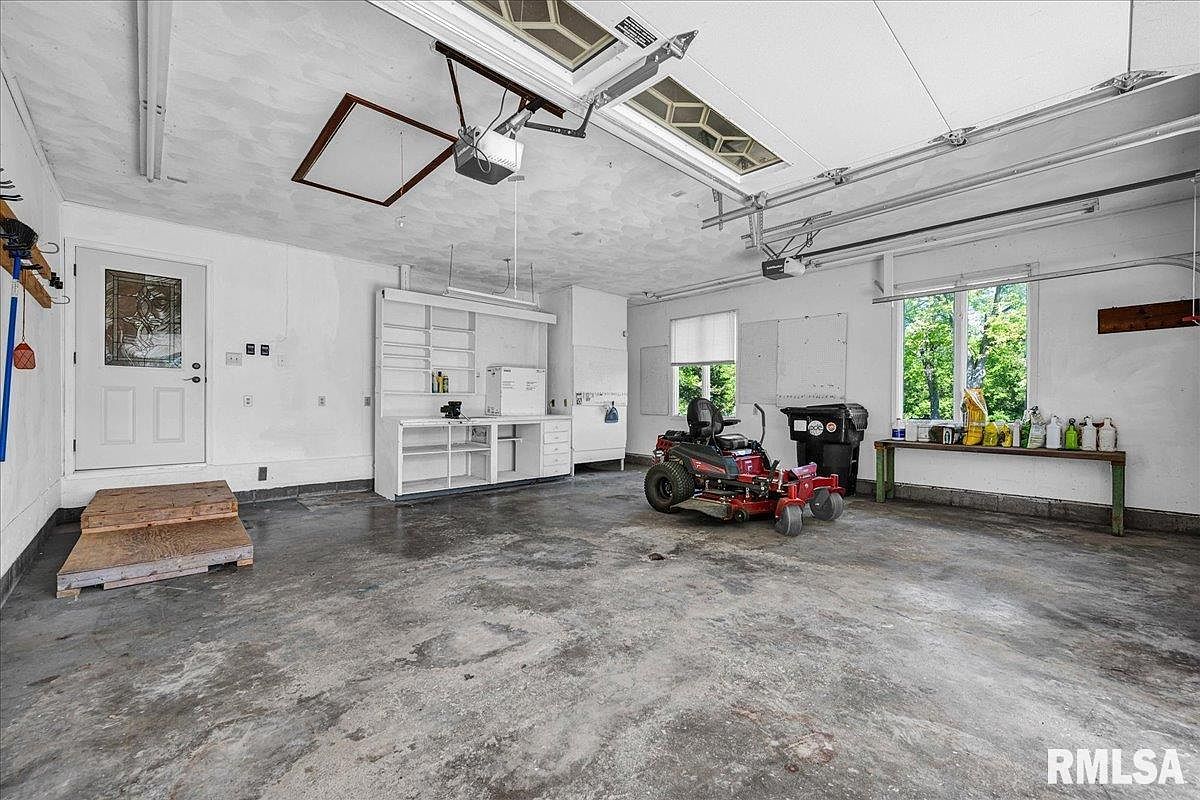 This spacious garage features a polished concrete floor with some wear, contributing to a practical, utilitarian feel. The walls and ceiling are painted white, enhancing natural light from two garage door windows and a side window with a white roller shade. A sturdy wooden workbench beneath the side window holds various garden and cleaning supplies, reflecting organized storage. On the adjacent wall, built-in white shelving and cabinetry offer additional workspace and storage. The ceiling is textured and fitted with fluorescent lighting. A red riding lawn mower is parked centrally, emphasizing the area’s dual function for storage and maintenance tasks.