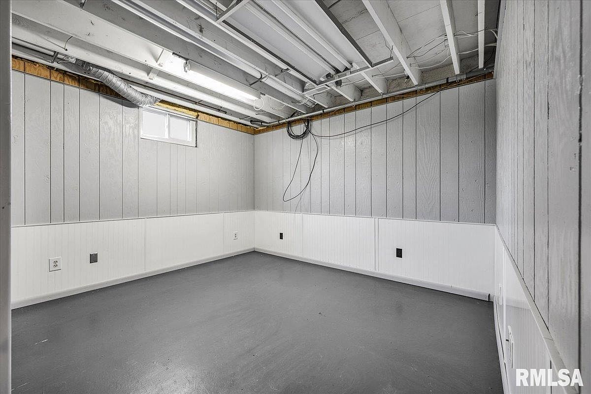 This basement area features unfinished wooden paneling on all walls, showcasing a rustic, utilitarian aesthetic. The ceiling is exposed, with visible white-painted beams and ductwork adding to the industrial feel. Two small windows allow natural light to filter in, complementing the cool gray concrete floor. Black electrical outlets and trim contrast subtly with the warm wood tones. The space is spacious and open, primed for use as storage or a workshop. Minimal decoration emphasizes function over form, making this a flexible area in the home with potential for future customization.