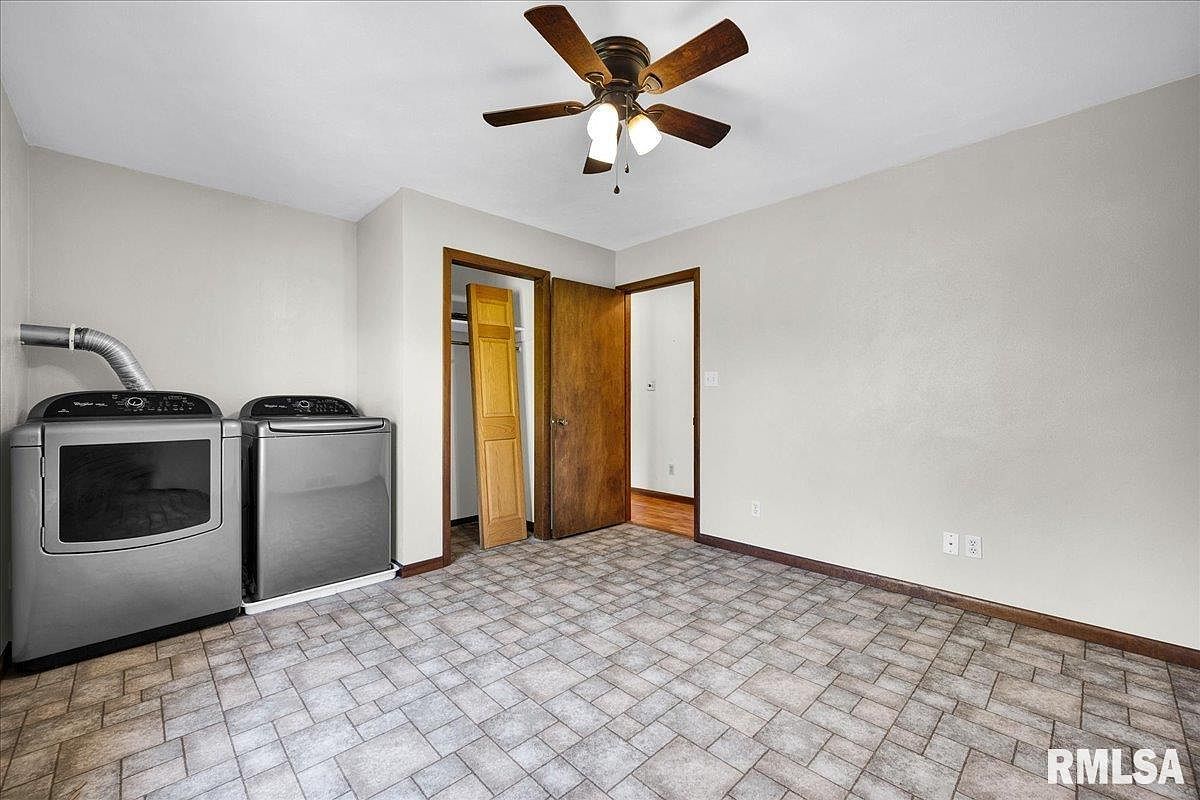 This laundry room features a practical and spacious layout, with a matching dark gray washer and dryer set positioned side by side against one wall. The floor is covered in a durable, multi-toned tile with a woven pattern, contributing a subtle texture to the space. Walls are painted in a light, neutral hue that brightens the room while wooden door frames and baseboards provide a warm contrast. A ceiling fan with wooden blades and three light bulbs hangs above, ensuring adequate airflow and lighting. An open closet space next to the appliances offers convenient storage options.