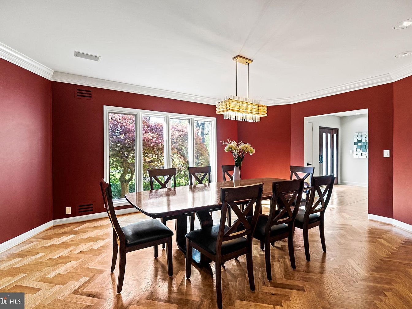 This elegant dining room features rich, deep red walls that add warmth and sophistication, contrasted by bright white crown molding and ceiling. A large rectangular window floods the space with natural light while offering scenic views of a beautifully colored tree outside. The floor is laid with a light wood parquet pattern that complements the dark wooden dining table and matching chairs upholstered in black cushions. A modern rectangular chandelier with gold accents hangs centrally above the table, adding a touch of glamour. The open doorway leads towards a lighter adjacent room, enhancing the room’s spacious feel.