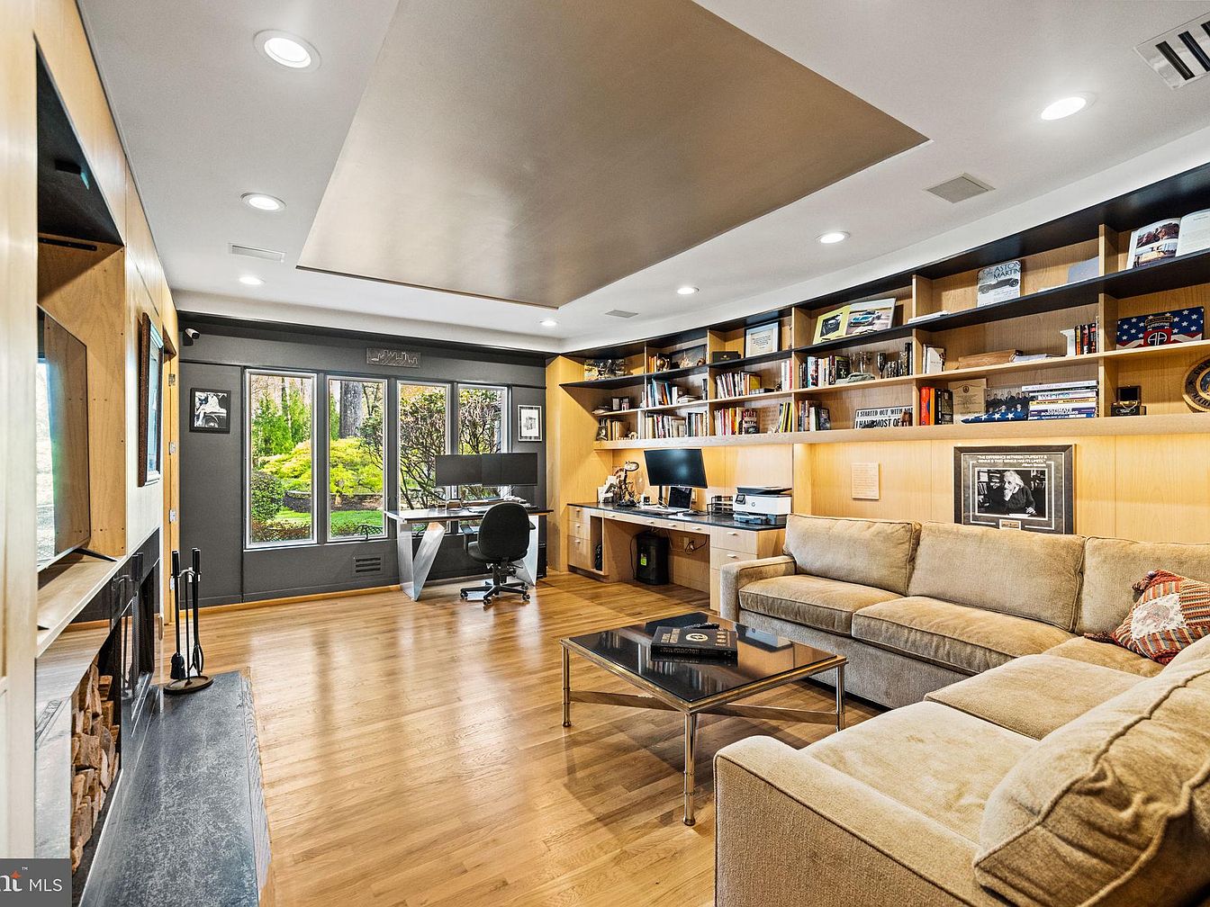 This spacious home office and lounge area combines functionality with comfort. Light-toned hardwood flooring extends across the room, complementing the beige sectional sofa that sits invitingly in the corner. A sleek black coffee table with metal legs anchors the seating area. The far wall features extensive built-in shelving filled with books and decor, highlighted by subtle under-shelf lighting that adds warmth and depth. Opposite the sofa, a modern glass desk is positioned by large windows that offer views of lush greenery outside. The ceiling has a recessed central panel with integrated lighting, contributing to the room’s contemporary yet cozy atmosphere. A fireplace adds a touch of traditional charm to the workspace, making this a perfect blend of relaxation and productivity.