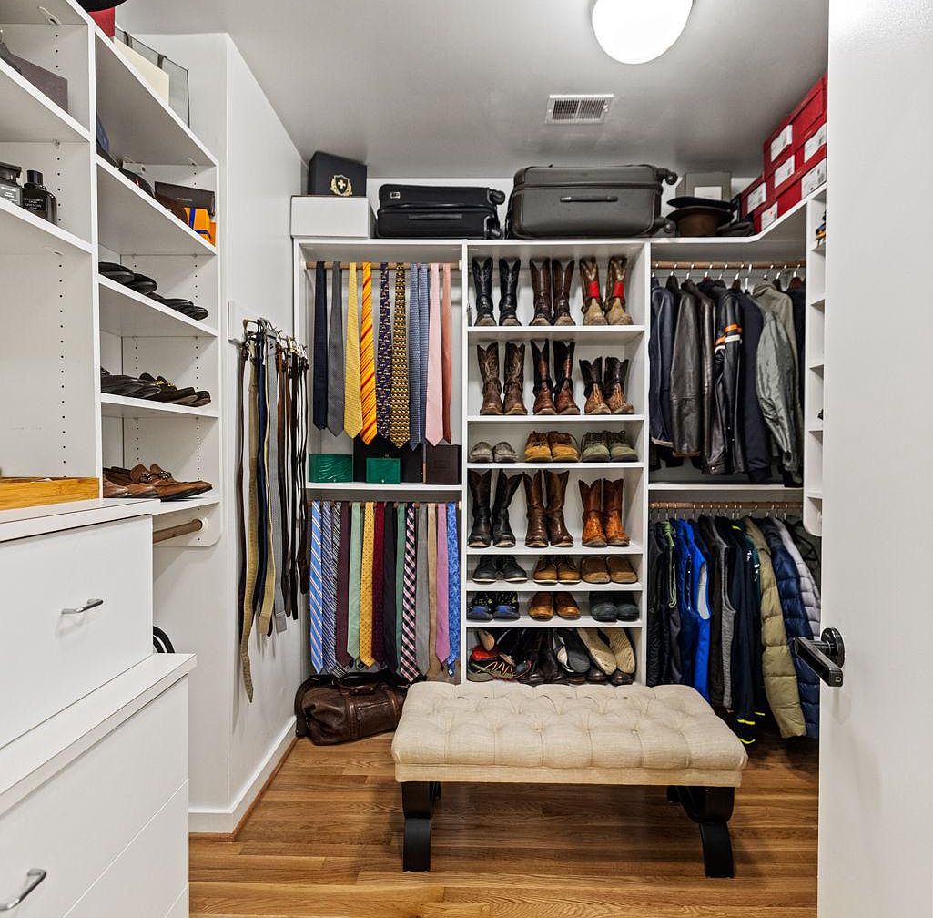 This well-organized walk-in closet features floor-to-ceiling white shelving units on three walls that maximize storage capacity. The left side accommodates shoes on open shelves and several white drawers below, while the central section presents neatly hung colorful ties and belts, along with multiple shelves filled with an assortment of boots and shoes arranged by type and color. The right side is designed for hanging jackets and coats, with a mix of heavier winter wear and lighter outerwear. A beige tufted bench with dark wooden legs sits at the center on warm hardwood flooring, creating a blend of function and comfort in this compact yet efficiently designed space.