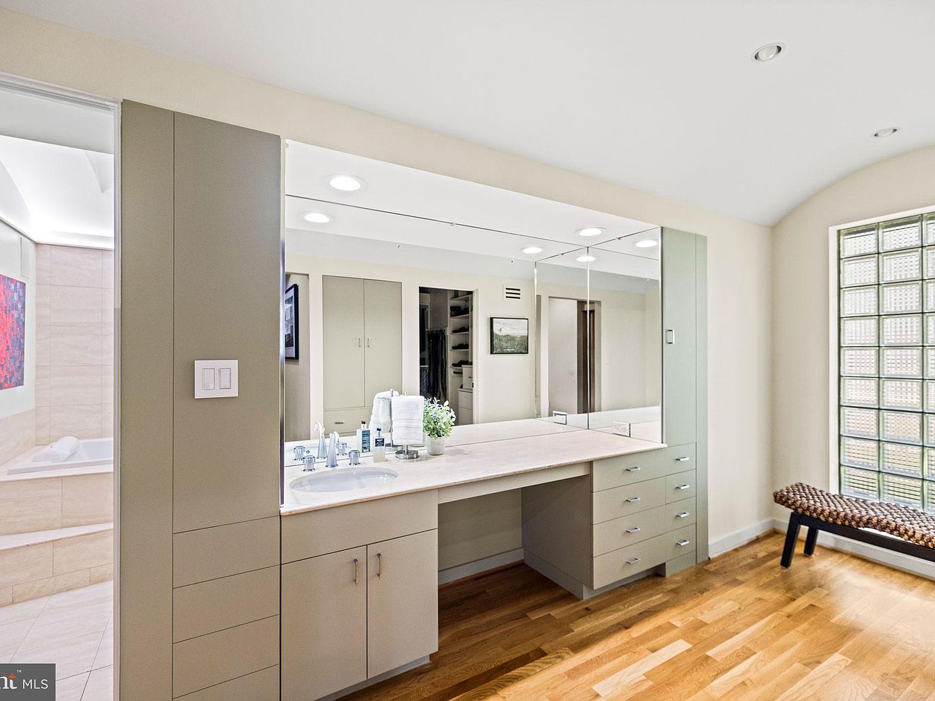 This space features a lengthy bathroom vanity with multiple drawers and cabinets finished in a muted, taupe-gray tone. The countertop is light-colored, complementing the crisp white sink basin and modern chrome fixtures. A wide mirror spans the length of the vanity, enhancing the sense of openness and light. Recessed ceiling lights provide ample illumination without cluttering the space. Adjacent to the vanity, warm wood flooring adds a natural contrast to the otherwise soft, neutral color palette. A woven bench near a frosted glass block window introduces texture and lets in diffused light, creating a peaceful, functional bathroom corner.