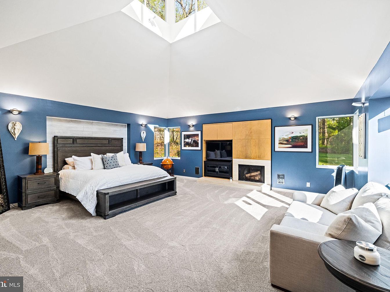 The master bedroom showcases a high vaulted ceiling with a unique skylight at the pinnacle, flooding the room with natural light. Deep blue walls create a serene ambiance, contrasting elegantly with the light beige carpeting that covers the spacious floor. A dark wood bed frame anchors the room, accompanied by matching nightstands and lamps that add warmth. A cozy sitting area with a pale sofa is positioned near two ample windows offering views of the greenery outside. The room also features a modern built-in fireplace surrounded by light wood cabinetry, adding both style and function to this tranquil retreat.
