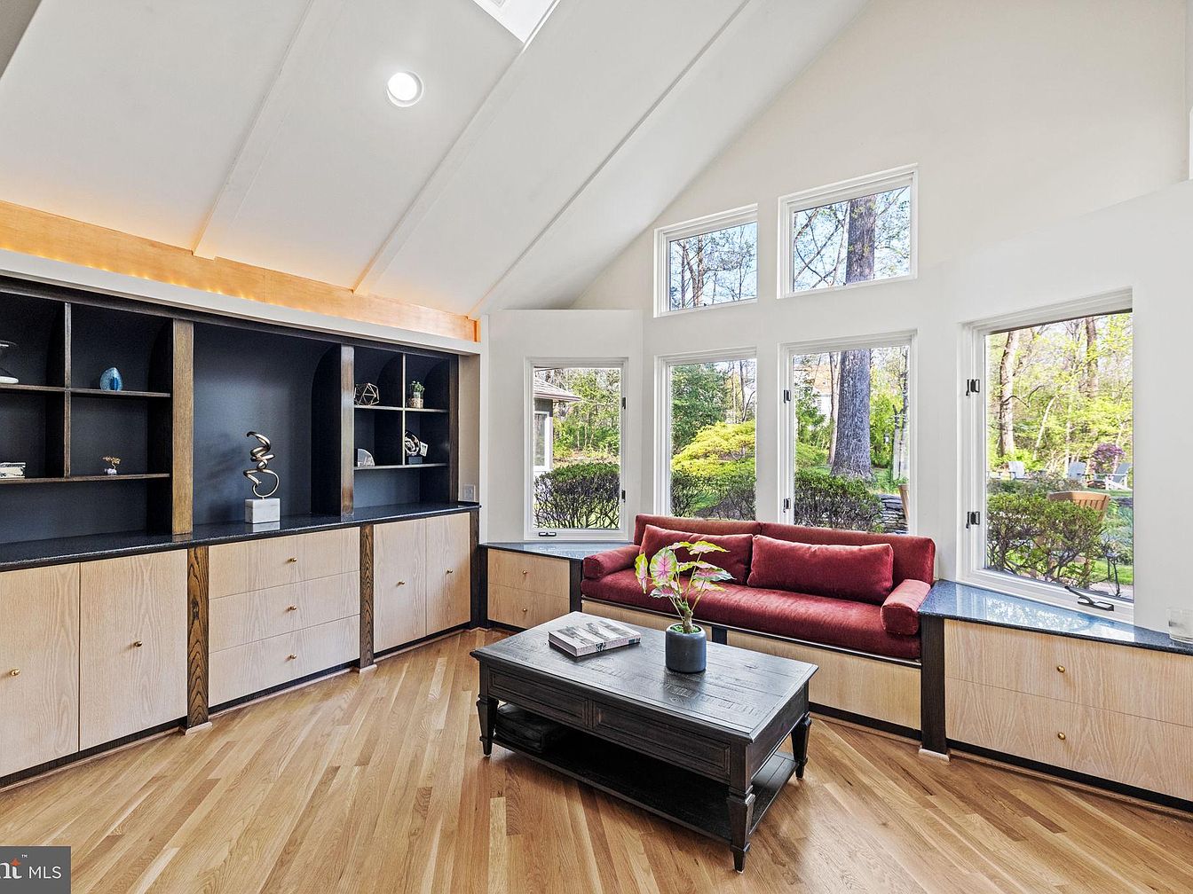 This charming sitting area is bathed in natural light from a series of large, rectangular windows that offer tranquil garden views. The vaulted ceiling with soft recessed lighting enhances the spacious feeling, while the black and light wood built-in cabinetry adds both storage and an artistic touch with display shelves for decorative items. A deep red cushioned bench seat built into the window alcove invites relaxation, complementing the warm hardwood floor. The dark wood coffee table anchored in the center adds contrast and functionality, creating a perfect nook for unwinding or casual conversation.