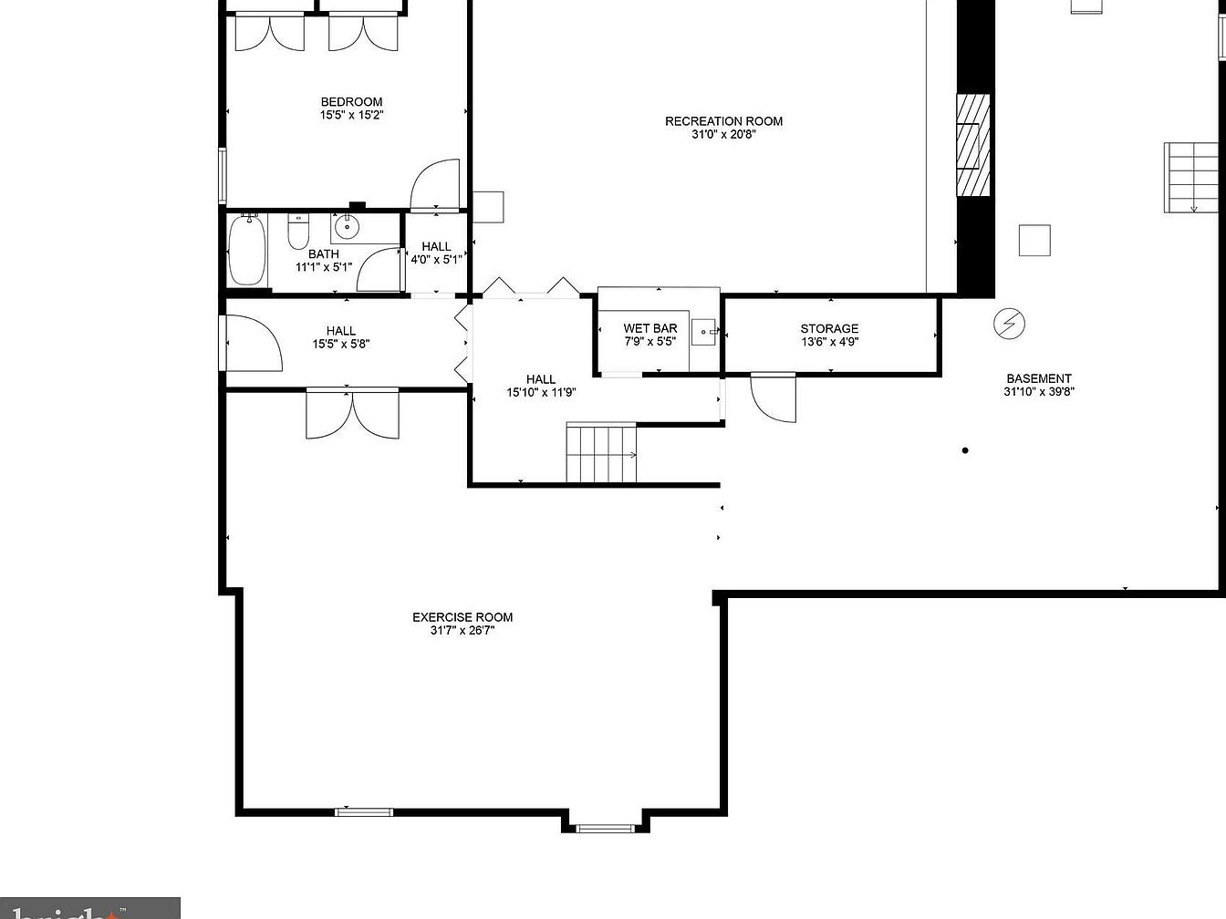 This spacious basement layout features multiple designated areas to cater to varied lifestyle needs. It includes a large exercise room measuring 31’7″ by 26’7″, perfect for fitness enthusiasts, adjacent to a bedroom with easy access to a full bath. A central hall connects the bedroom and bath to a generous recreation room, ideal for gatherings or entertainment. The layout also includes a wet bar for convenient refreshments, as well as a separate storage space. The staircase is centrally located, providing seamless transitions between floors, emphasizing functional flow and practical living use.