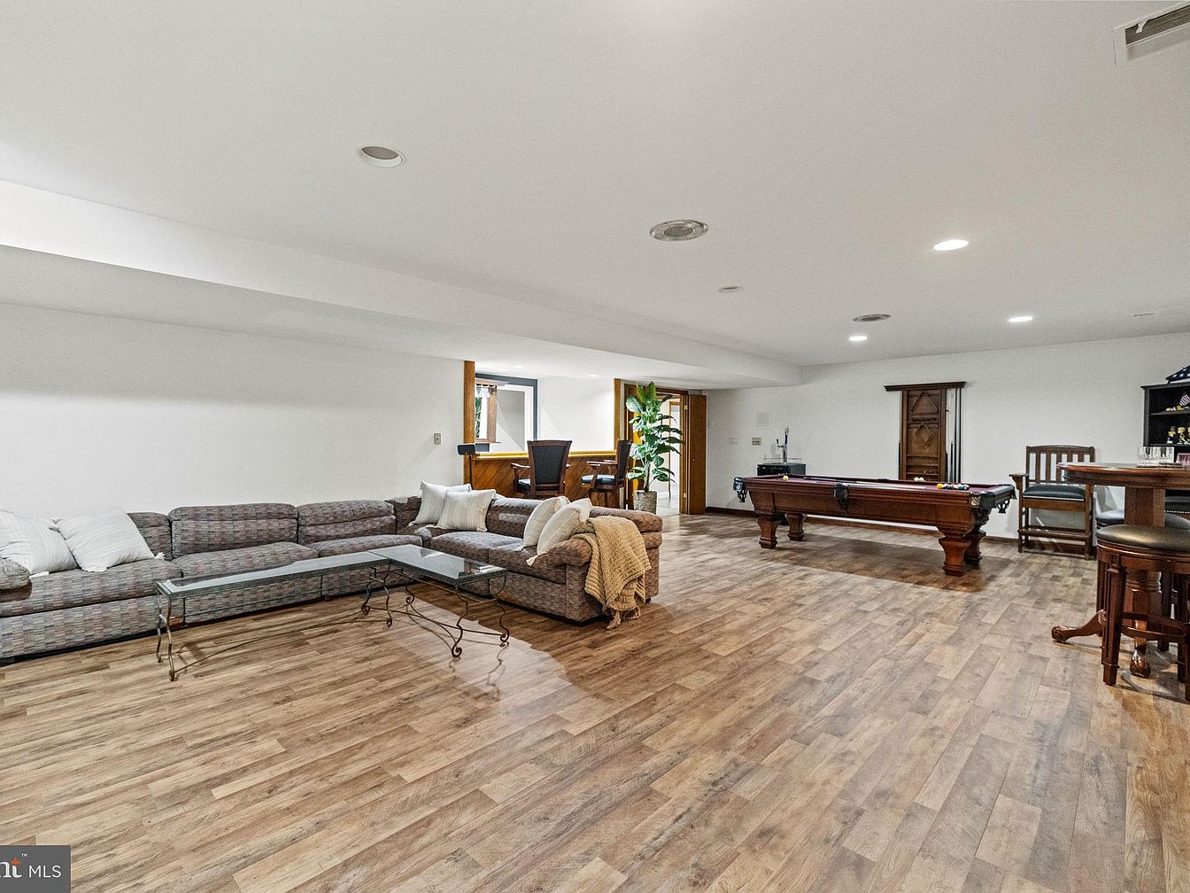 This spacious basement recreation area features a warm wood-look vinyl plank floor extending through the open layout. A large, comfortable sectional sofa with neutral-toned pillows anchors one side, paired with a glass-top coffee table possessing elegant wrought iron legs. The opposite side hosts a rich wood-finished pool table, adding a classic recreational charm. Adjacent are tall bar stools around a wooden high-top table, suggesting a gathering space for casual entertaining. Subtle recessed lighting and white walls keep the room bright and inviting, while a small alcove window section creates a cozy nook with a wooden built-in desk and green plant for contrast.