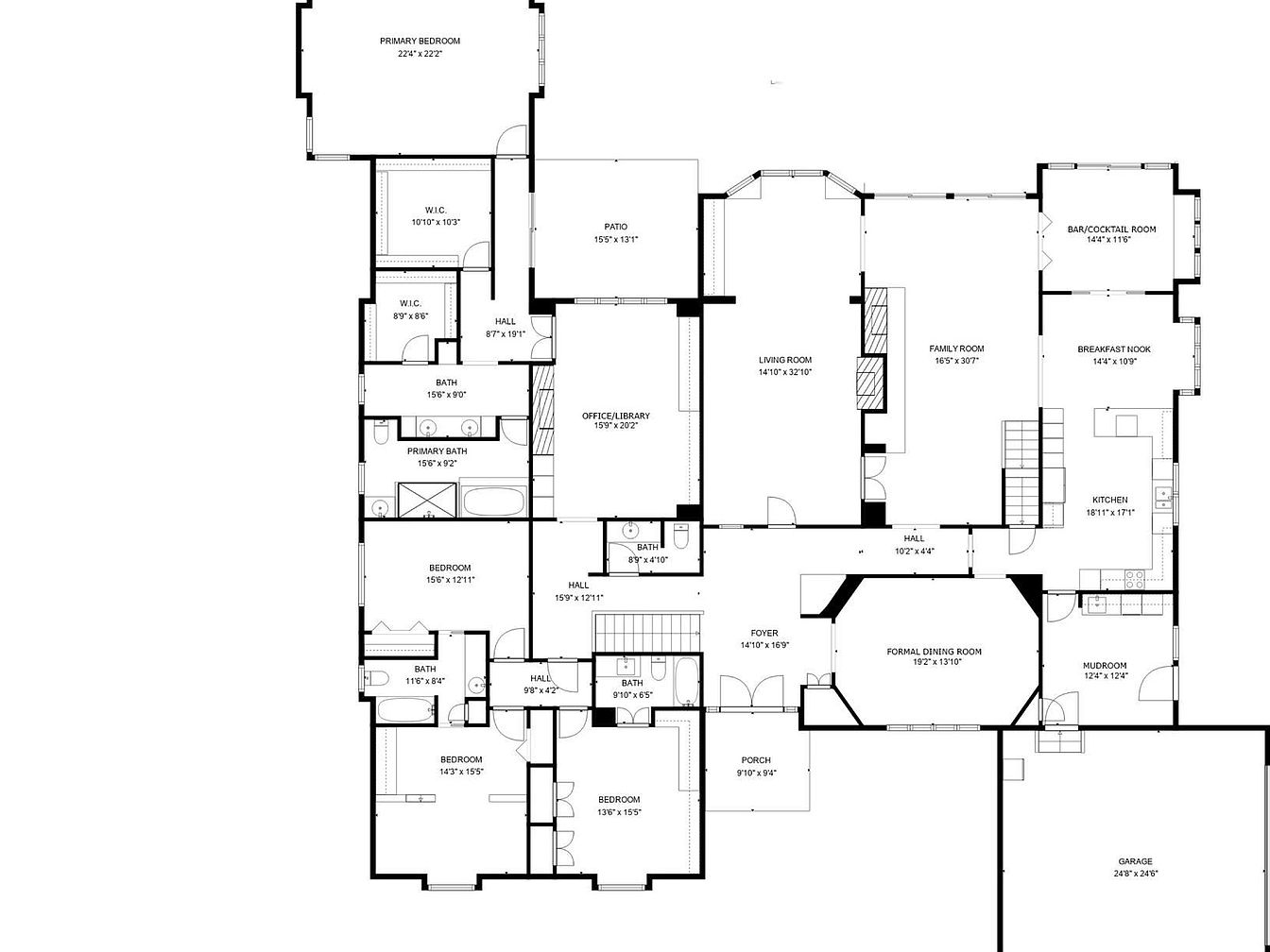 This detailed floor plan showcases a spacious single-level layout designed for functionality and comfort. The primary bedroom is generously sized with dual walk-in closets and an en suite bathroom. The central living areas include a large living room and family room separated by a fireplace, providing both communal and private gathering spaces. Adjacent to the kitchen, there is a breakfast nook and a bar/cocktail room, enhancing the home’s entertainment options. Multiple bedrooms and bathrooms are strategically positioned, with an office/library space adding versatility. Additional features include a formal dining room, mudroom, garage, and patio, emphasizing a well-rounded design suitable for family living and socializing.