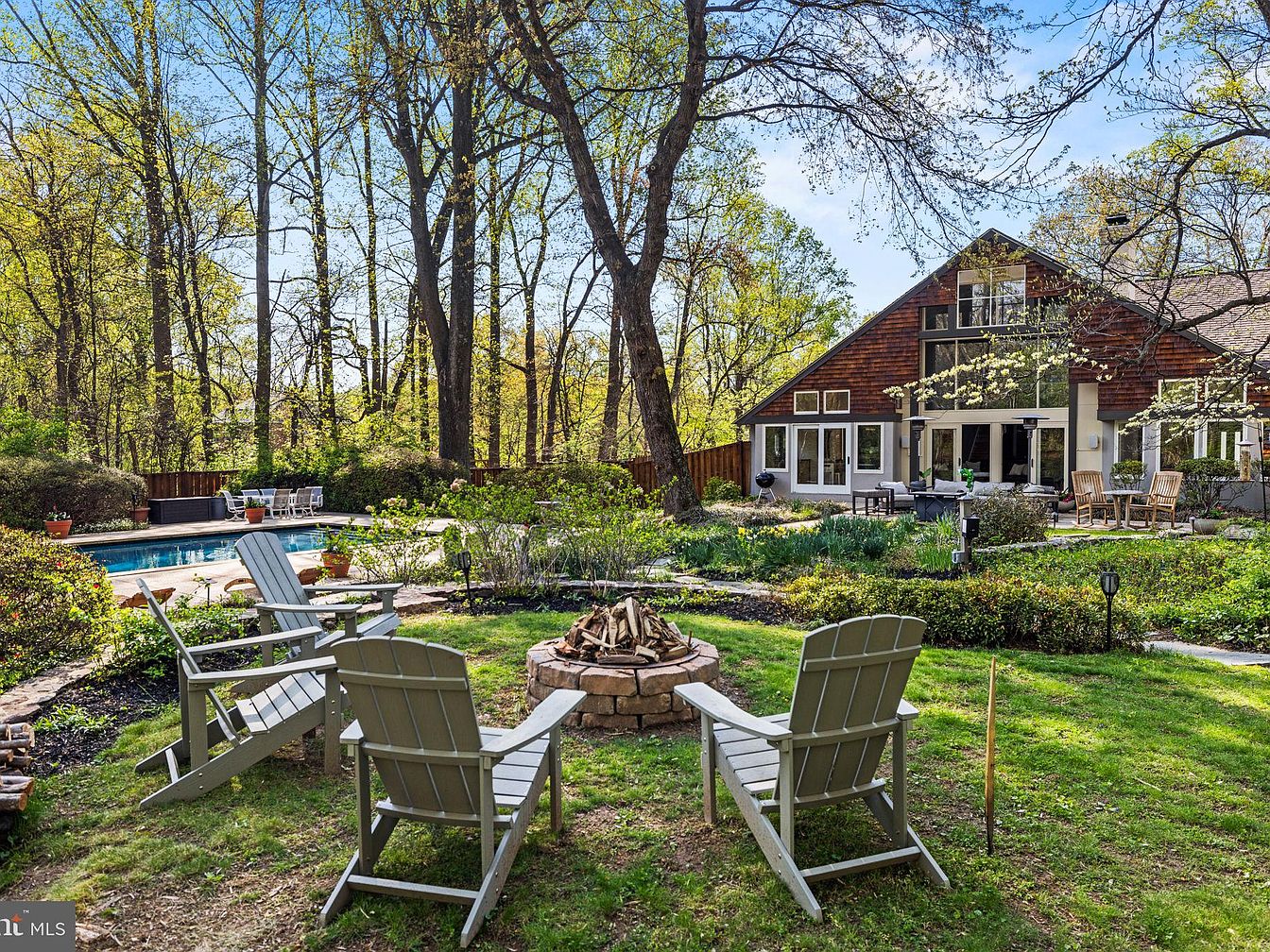 This spacious backyard features a cozy circular fire pit surrounded by four classic Adirondack chairs, ideal for outdoor gatherings. The area is lush with green grass and bordered by various shrubs and flowering plants, creating a serene, natural ambiance. To the left, a sparkling rectangular swimming pool offers a refreshing contrast to the greenery. The modern house’s exterior combines warm wooden shingles with large windows and glass doors, inviting plenty of natural light inside. Multiple seating areas on the stone patio enhance outdoor living options, seamlessly blending nature with comfort and style.